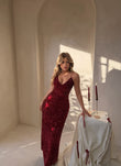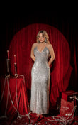 Fustan i gjatë elegant i zbukuruar me temina që shkëlqejnë, perfekt për mbrëmje dhe evente speciale.