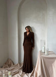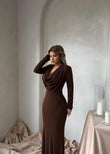 Fustan i gjatë me xixa në ngjyrë kafe, me krahë të gjatë. Elegant dhe ideal për mbrëmje apo evente speciale.