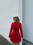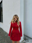 Fustan i shkurter me fjongo te vogla perpara. Me jake te hapur. Material i plote. Rrin i fryre ne fund.
