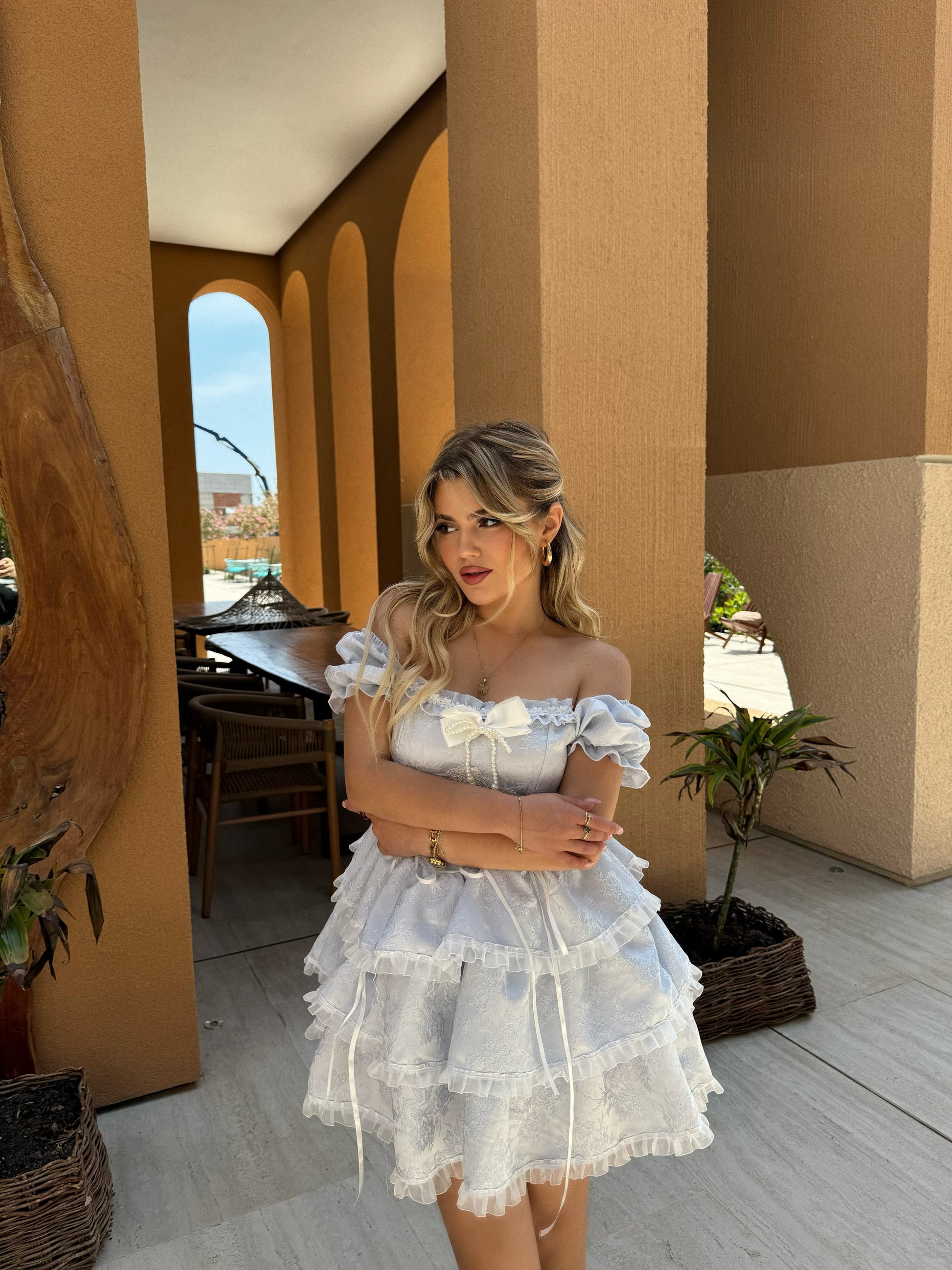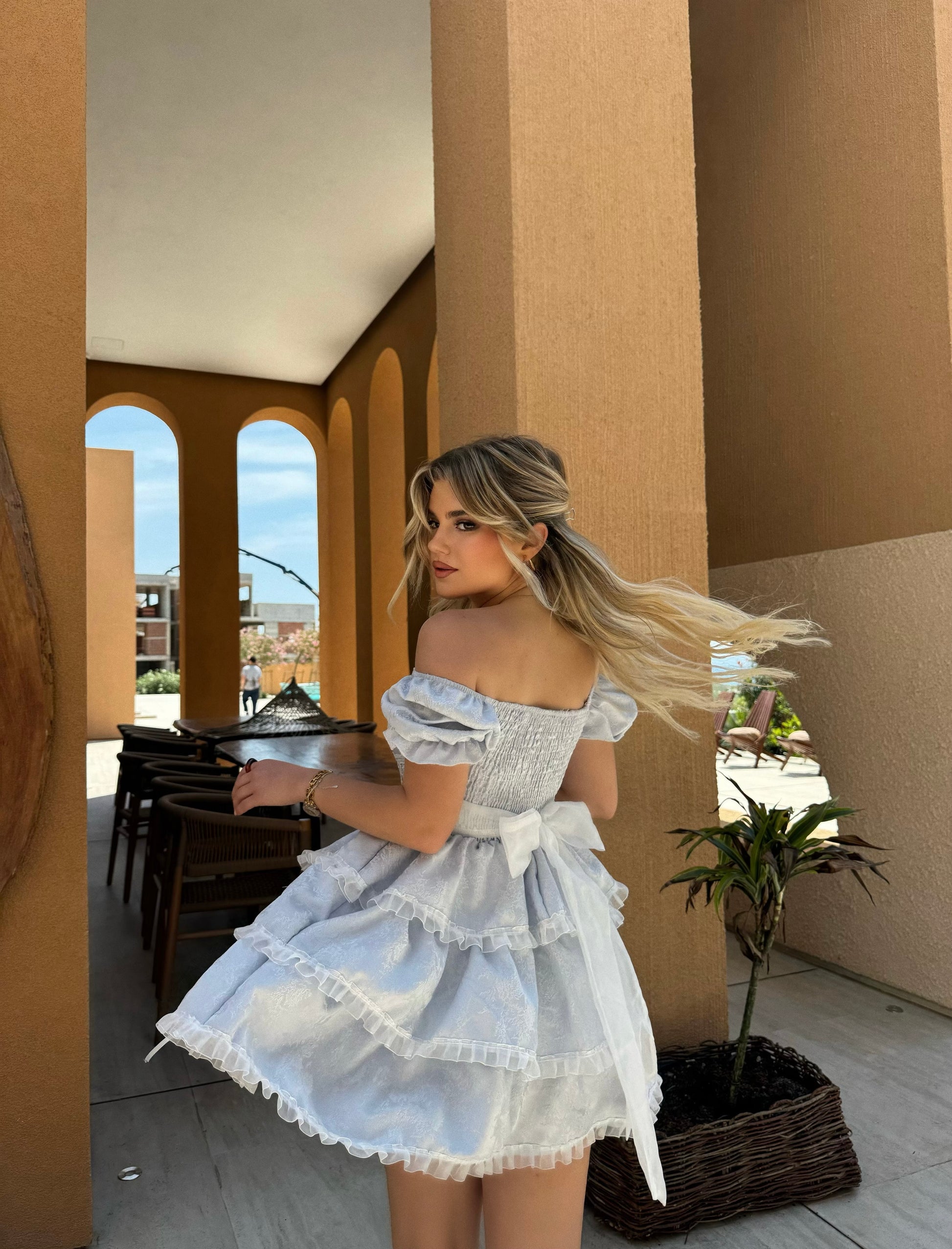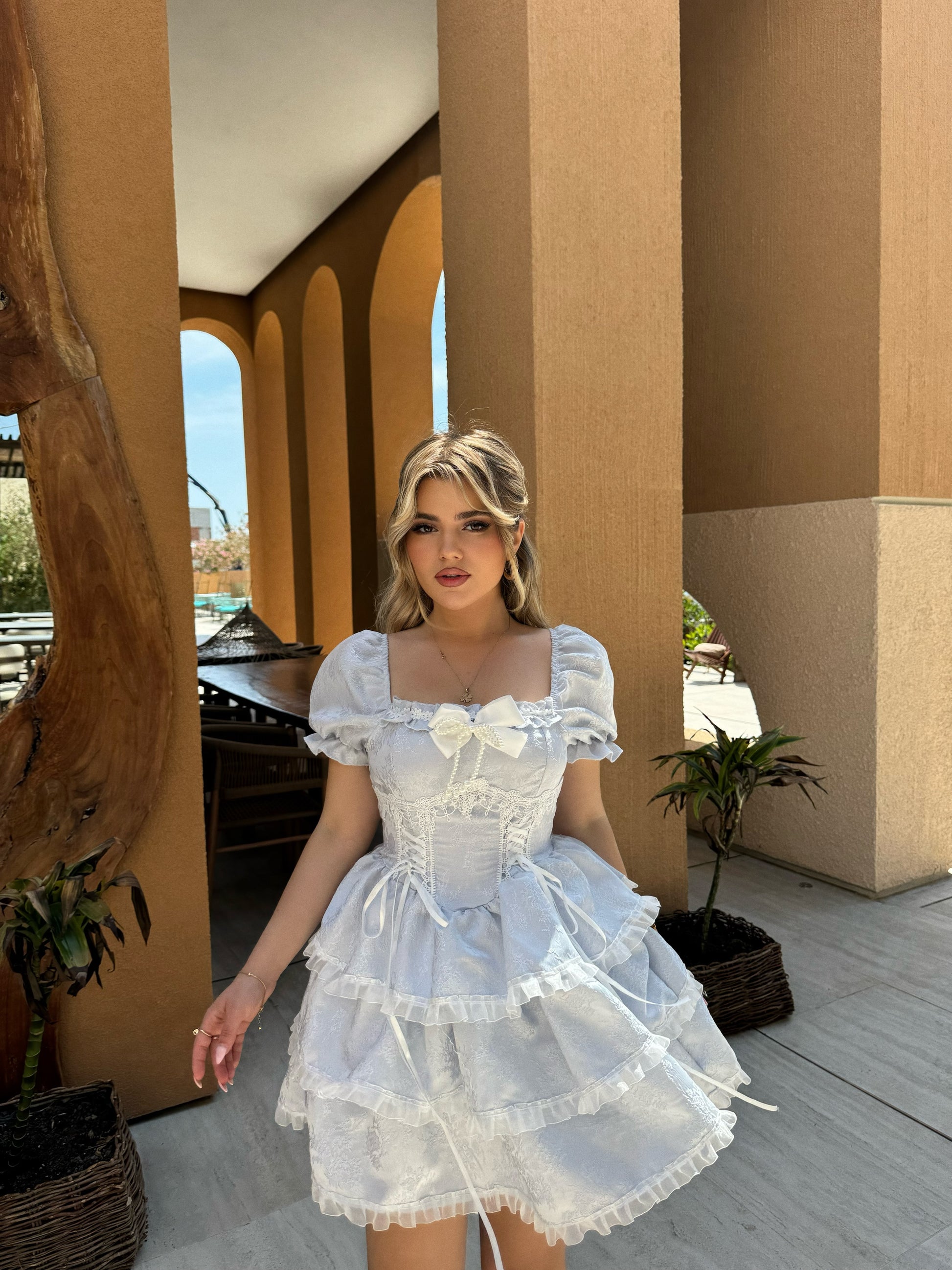 Fustan i shkurter me fjongo dhe rrip ne bel. Vjen me dantelle dhe lidhse para.Ka material te plote dhe cilesi fantastike.