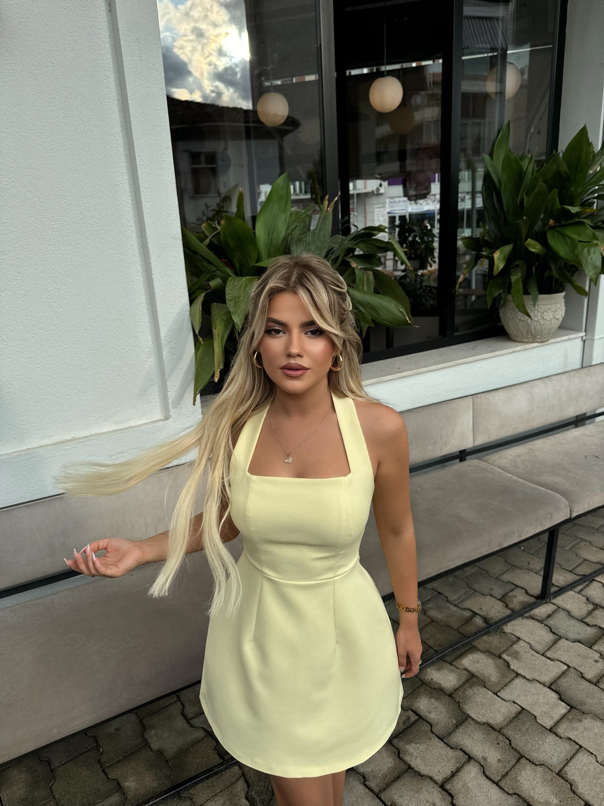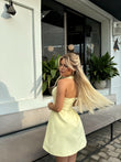 Fustan i shkurter ne ngjyren e verdhe. Eshte me rrip ne qafe dhe i thjeshte. Ka material te plote dhe cilesi fantastike.