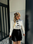 Fustan i shkurter me fjongo perpara. Vjen ne pjesen e bustit ne formen e nje kemishe me polka dhe poshte fund.