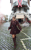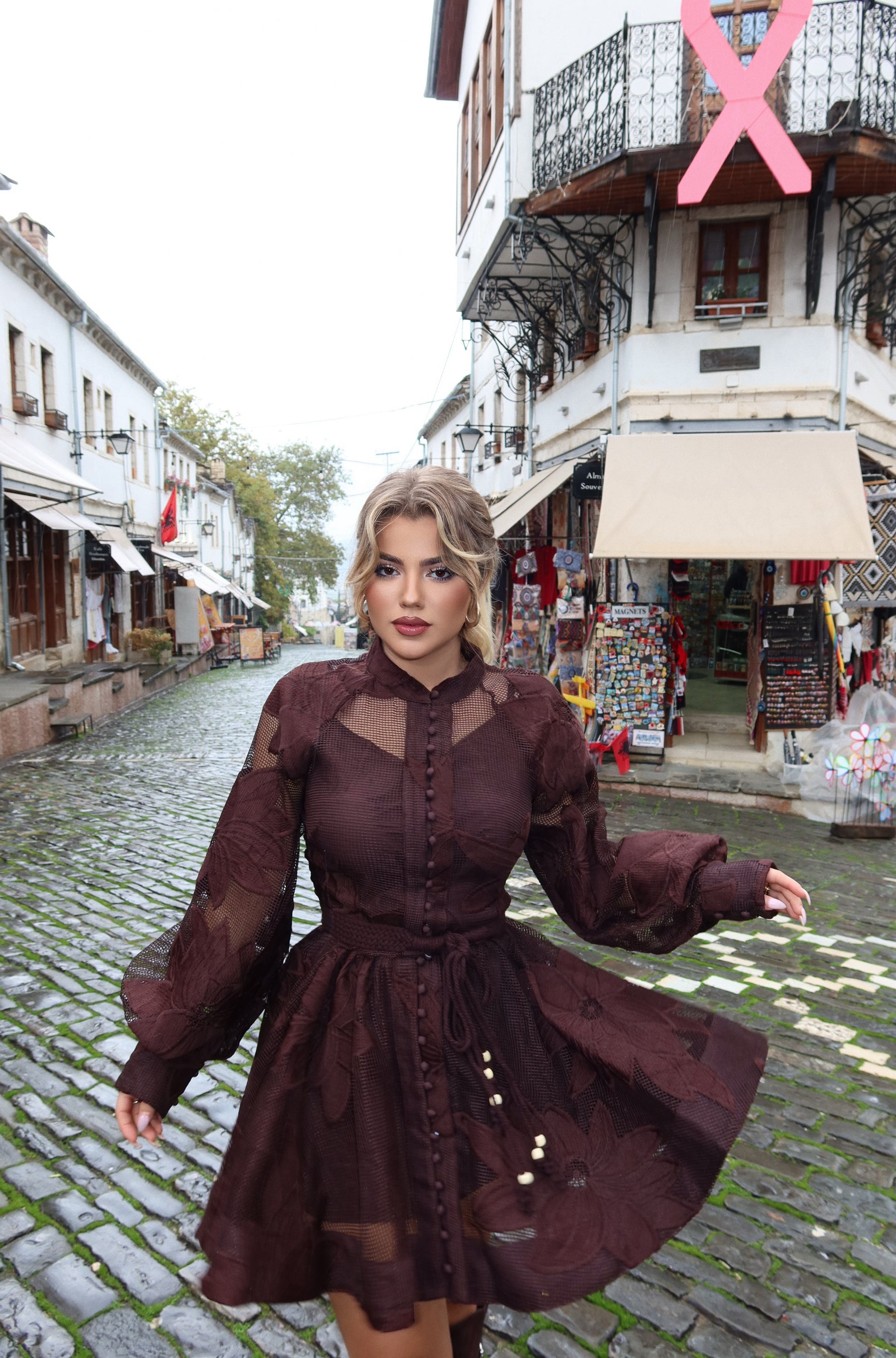 Fustan i shkurter me rrip ne bel. Me astar poshte dhe dantelle siper. Mbyllet me kopsa para.