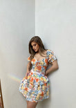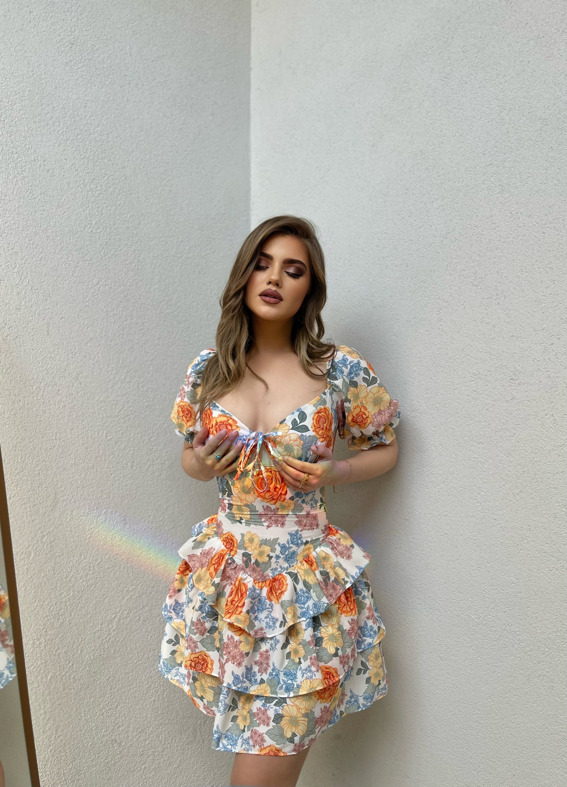 Fustan i shkurter me lule . Vjen me menge te shkurter dhe mberthimi behet nga mbrapa. Ka material te plote dhe detaje fantastike. Super komode & stil.