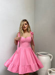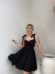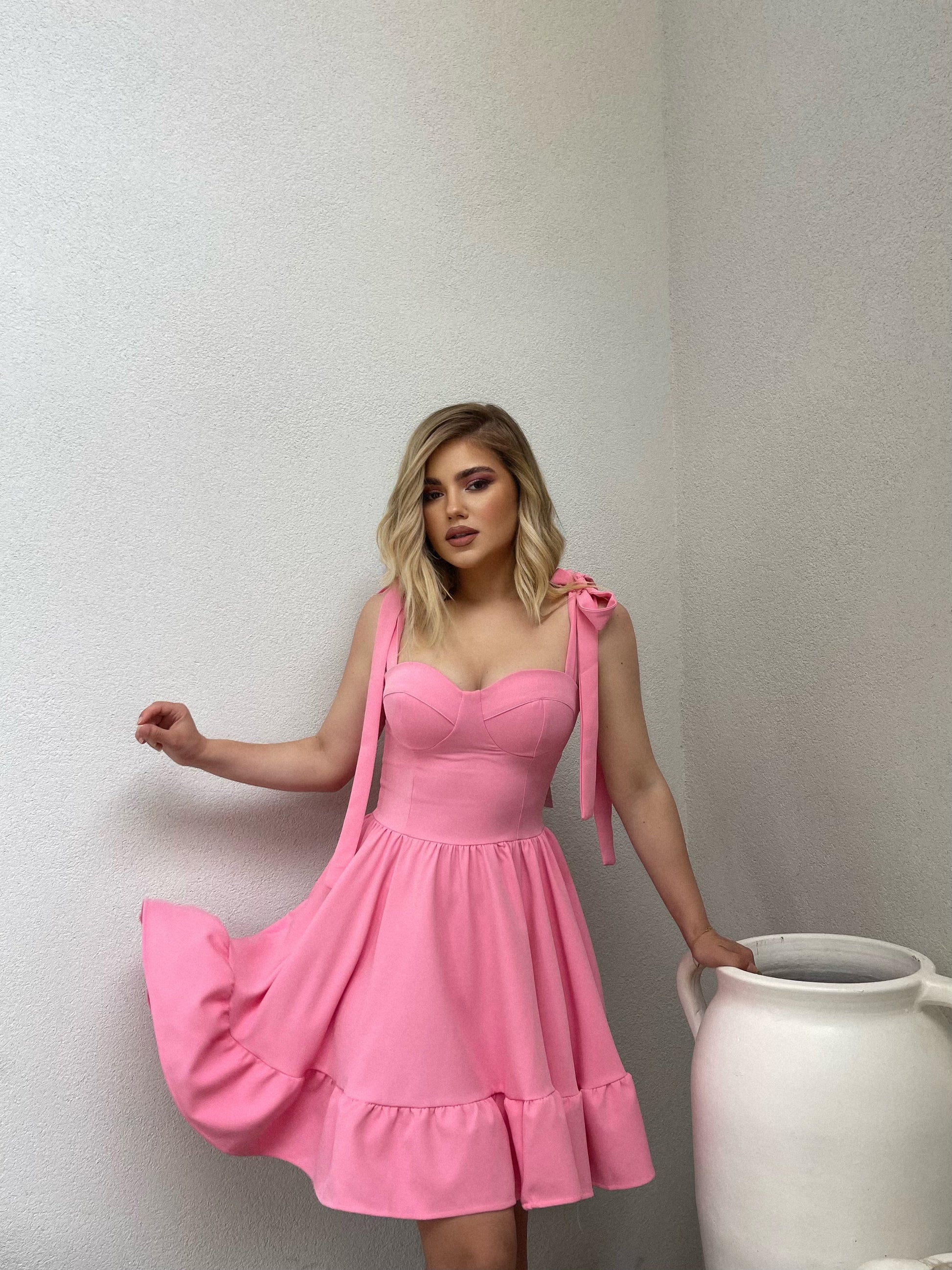 Fustan i shkurter me rripa. Vjen i ngushte ne bel dhe nga beli e poshte ka lirshmeri dhe vjen ne pala. Ka material te plote dhe cilesi fantastike.
