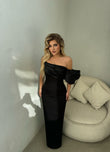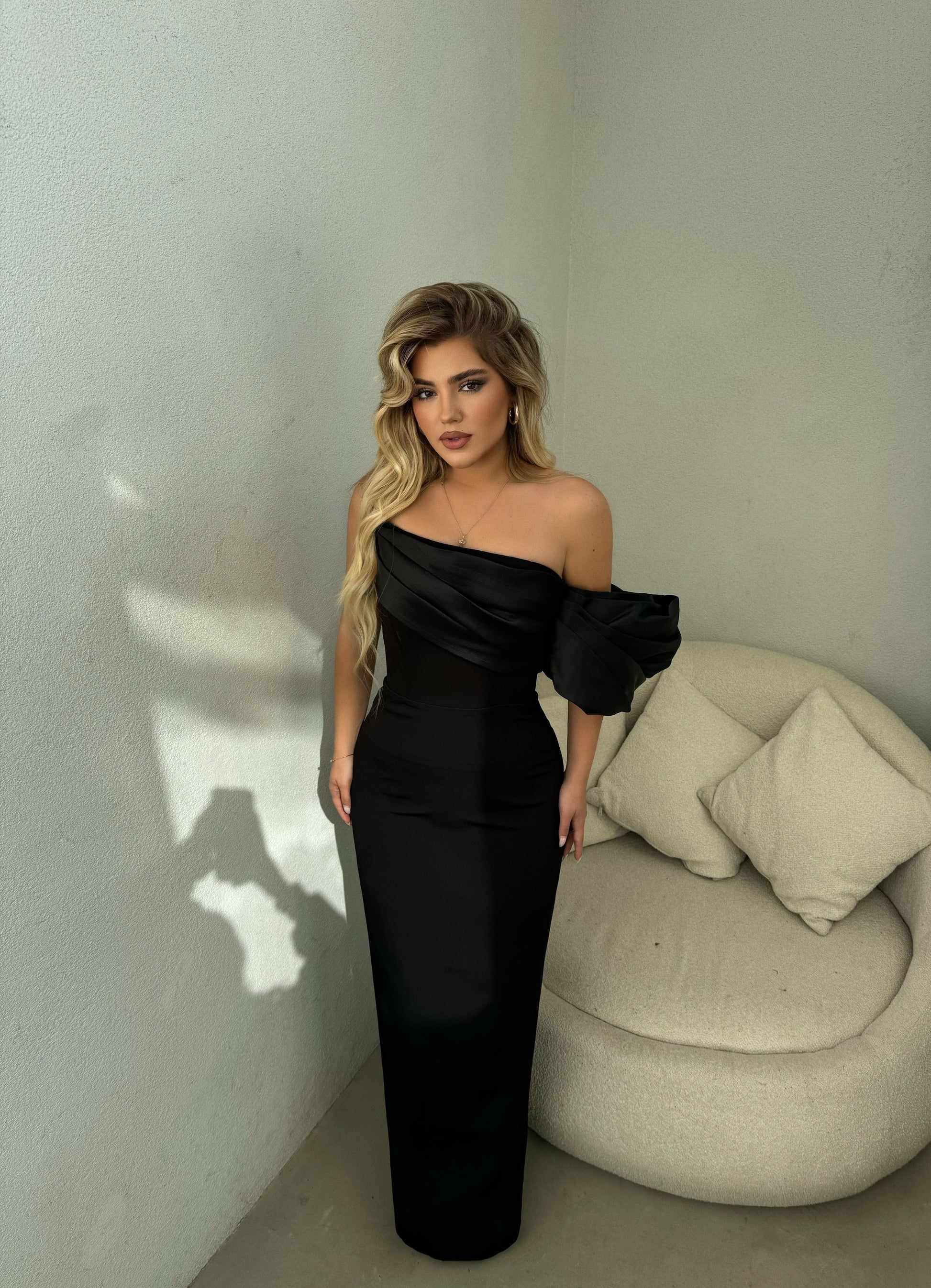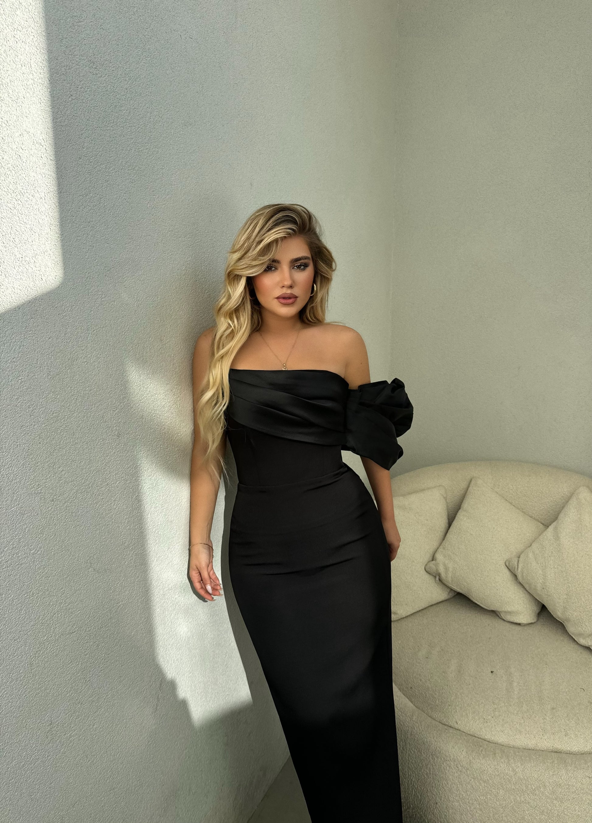 Fustan i zi. Fustan i gjate ngjyre e zeze, me material saten ne pjesen e siperme dhe nje menge te vetme voluminoze. Ka prerje elegante dhe stil formal.