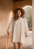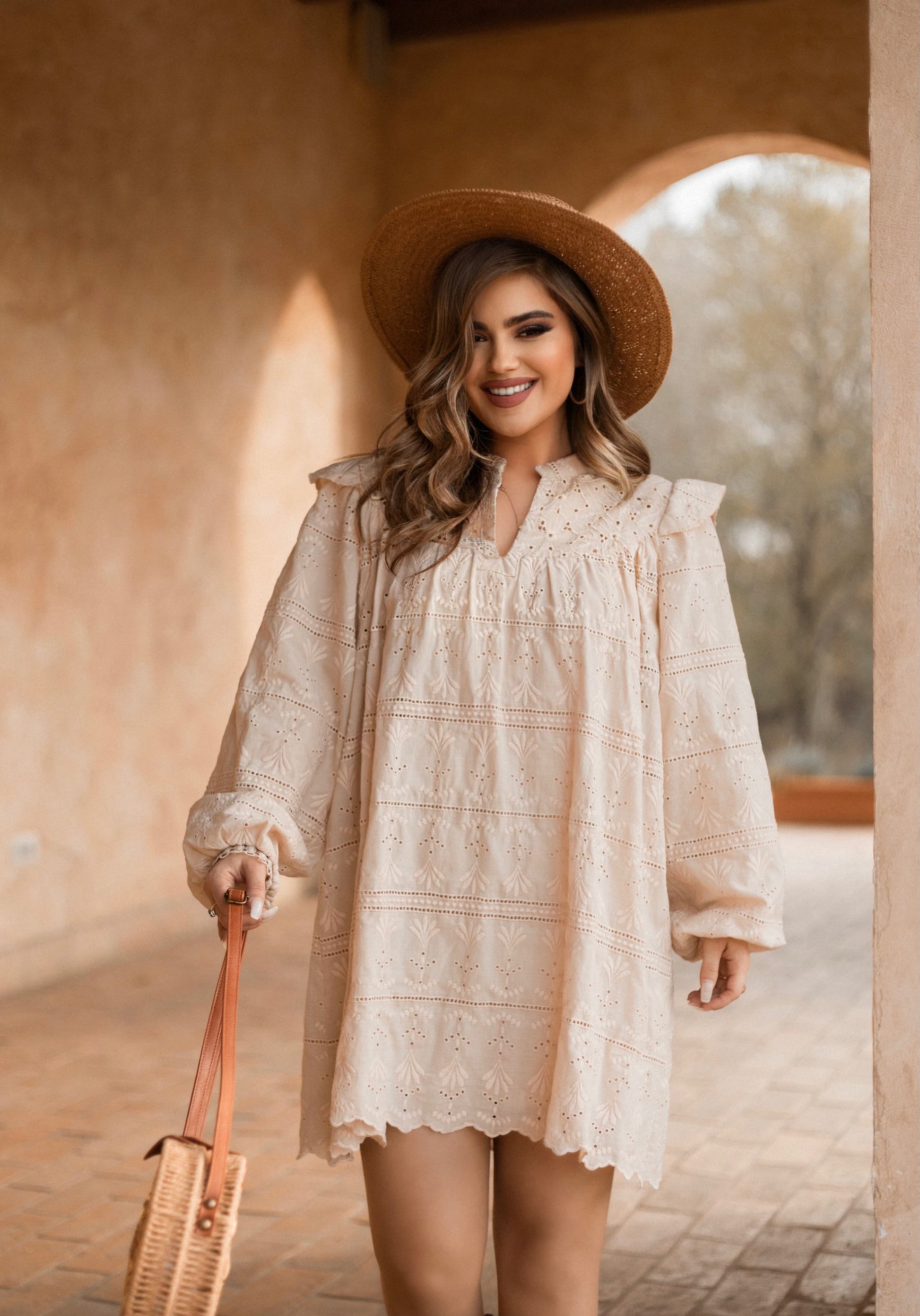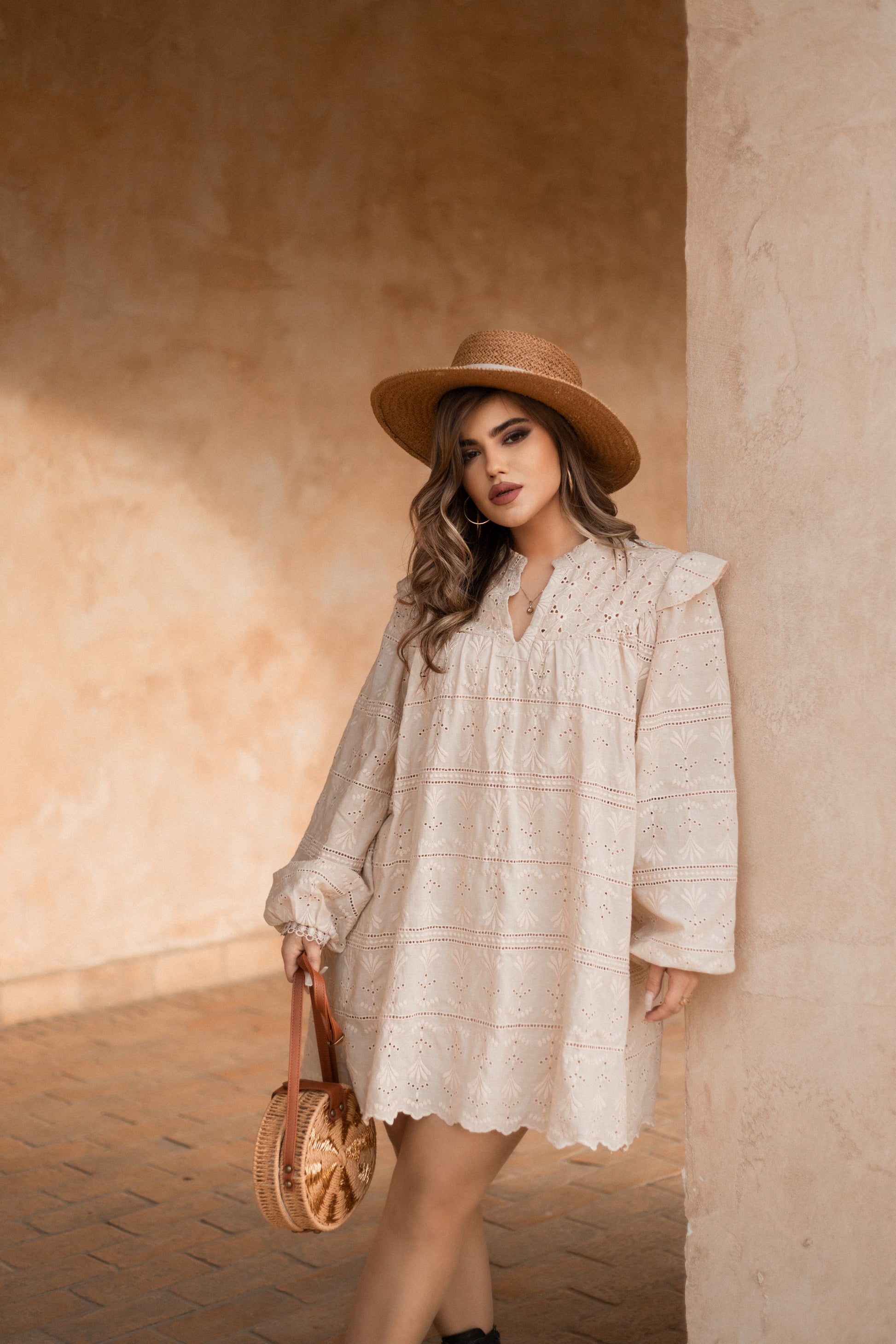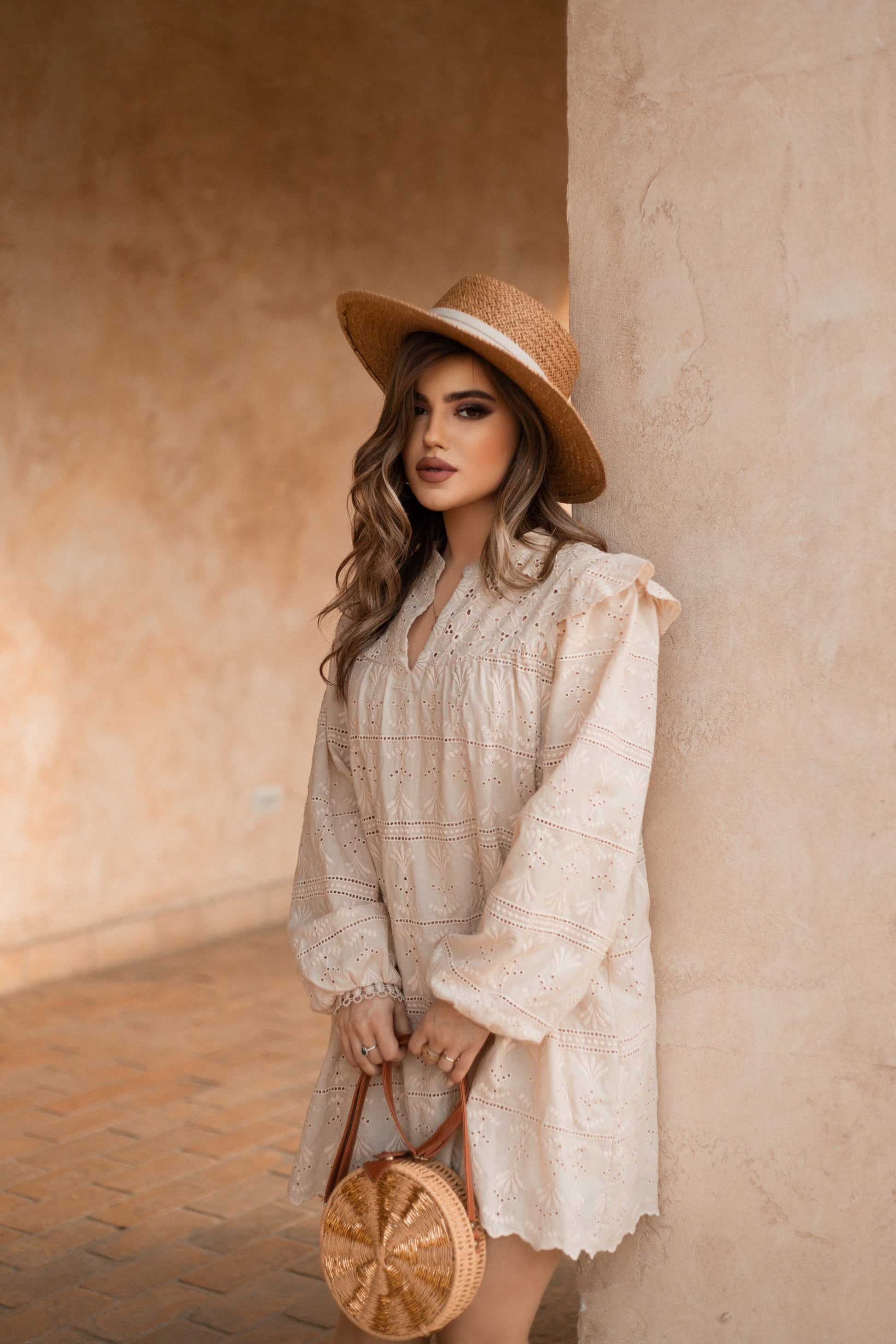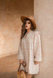 Fustan lino me jake te hapur. Ka llastik ne fund te mengeve dhe vjen i lirshem. Super komod dhe ka material te plote. Ka detaje lulesh ne te gjithe fustanin.