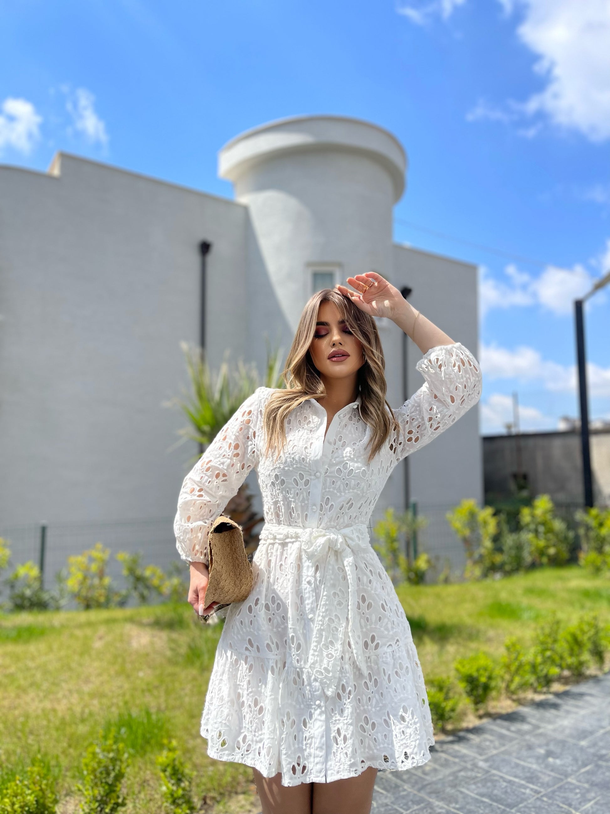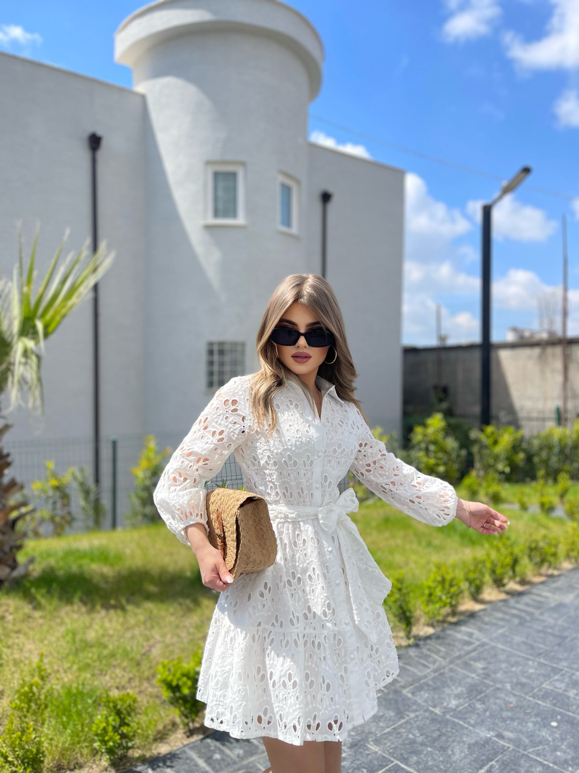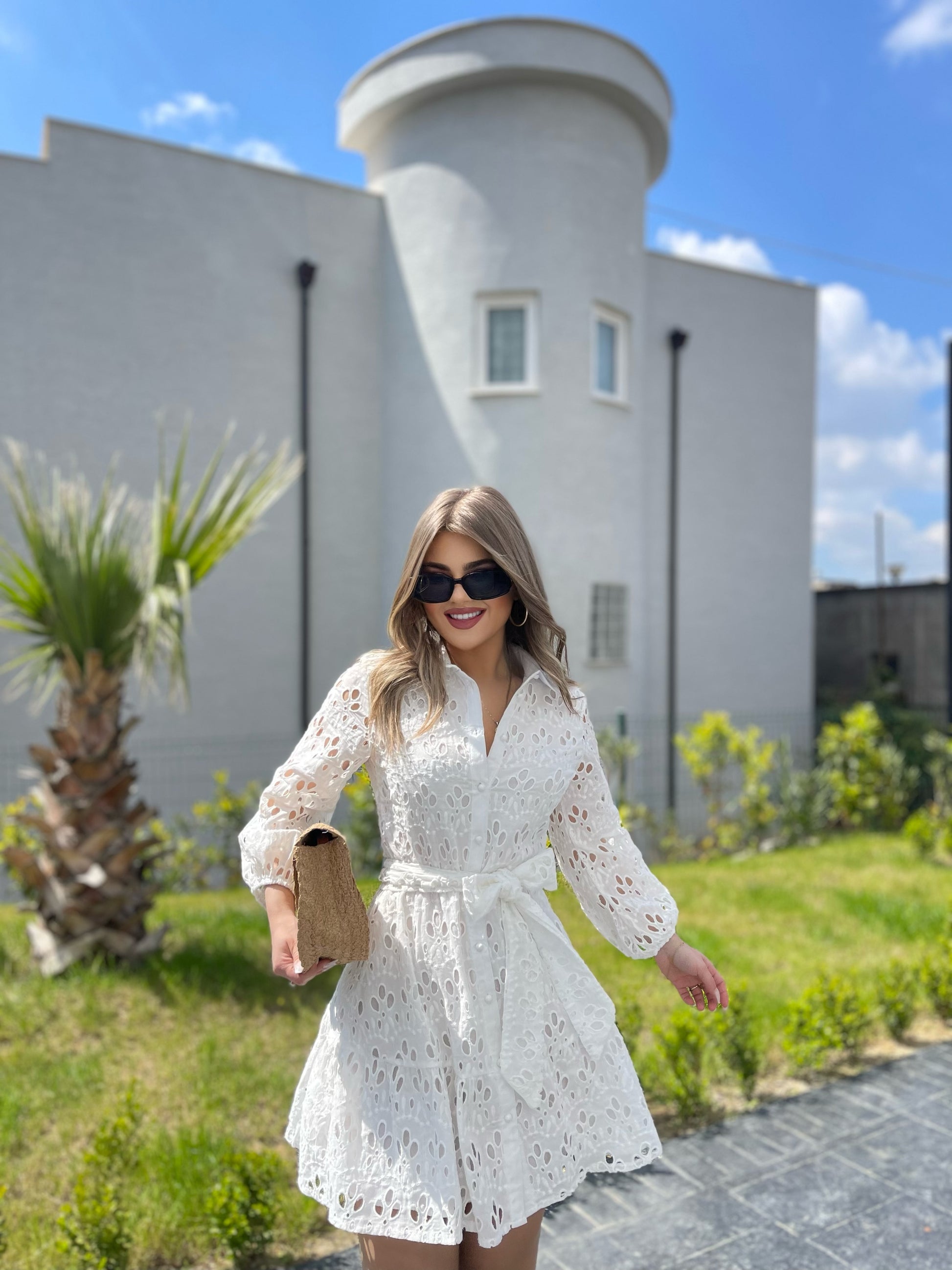 Fustan lino me lidhese ne mes. Ka grimca te vegjel te cara ne forme lulesh. Mberthimi behet me ane te kopsave dhe lidheses. Ka jake ne forme V-je dhe material te plote.