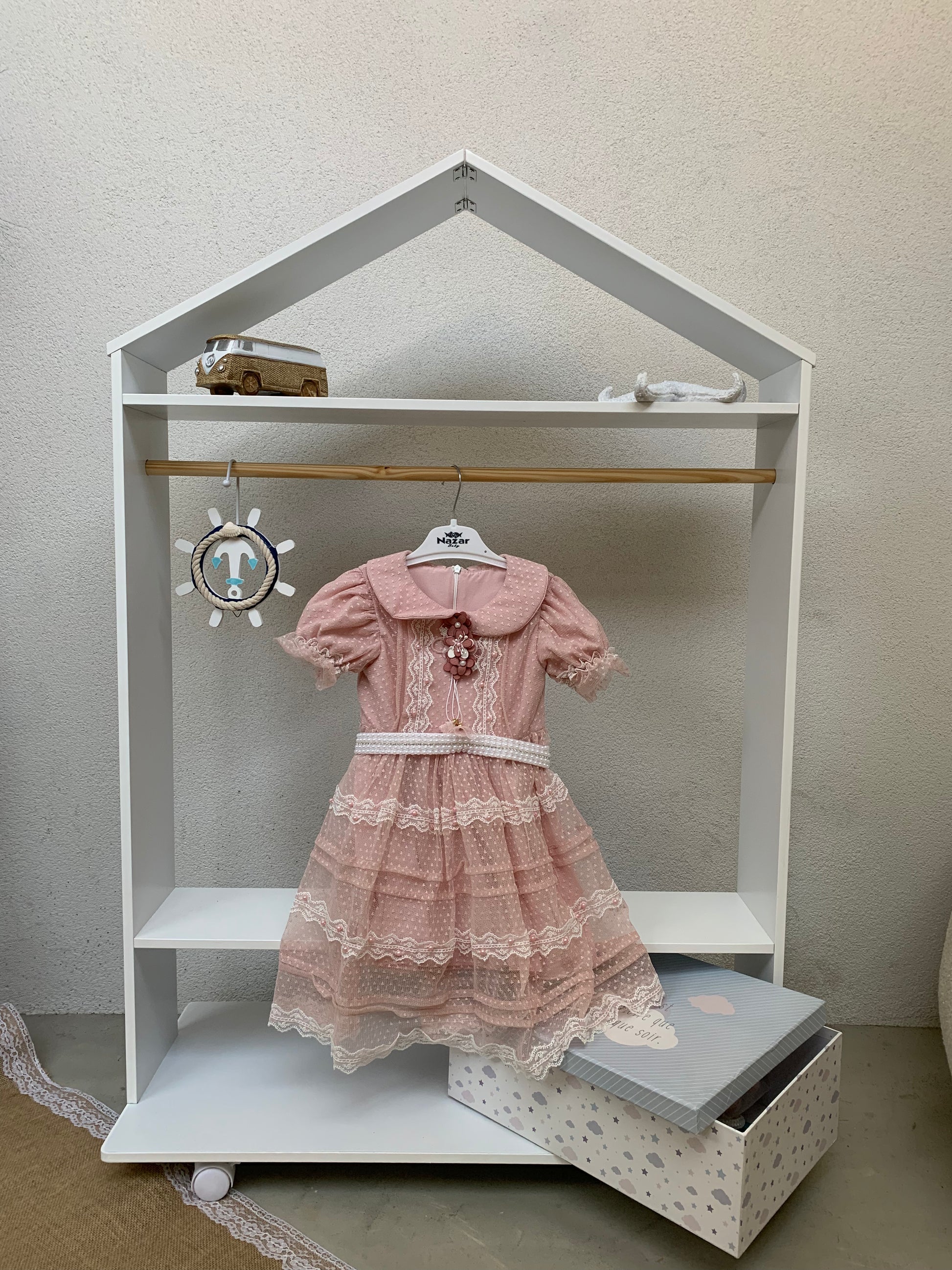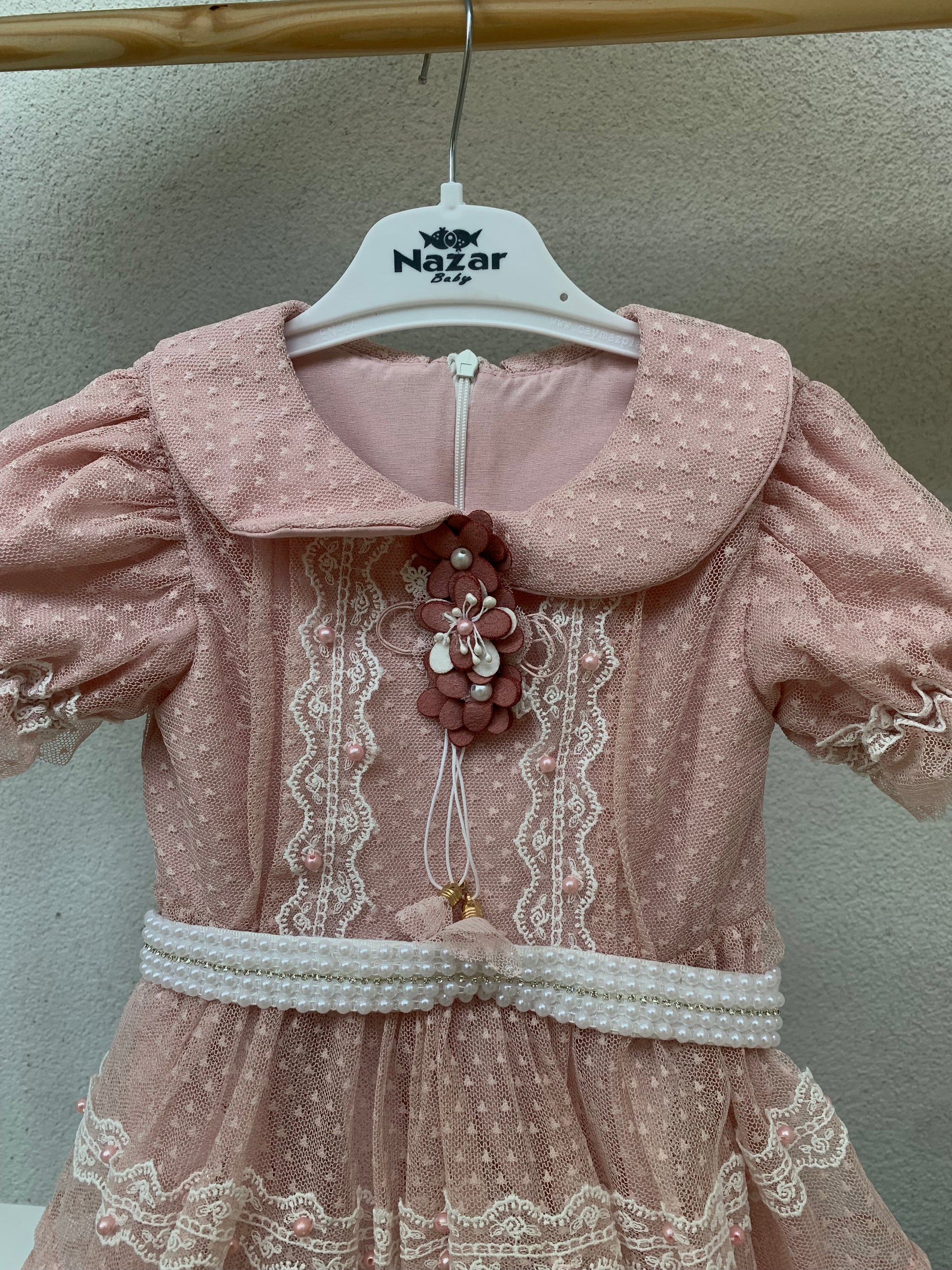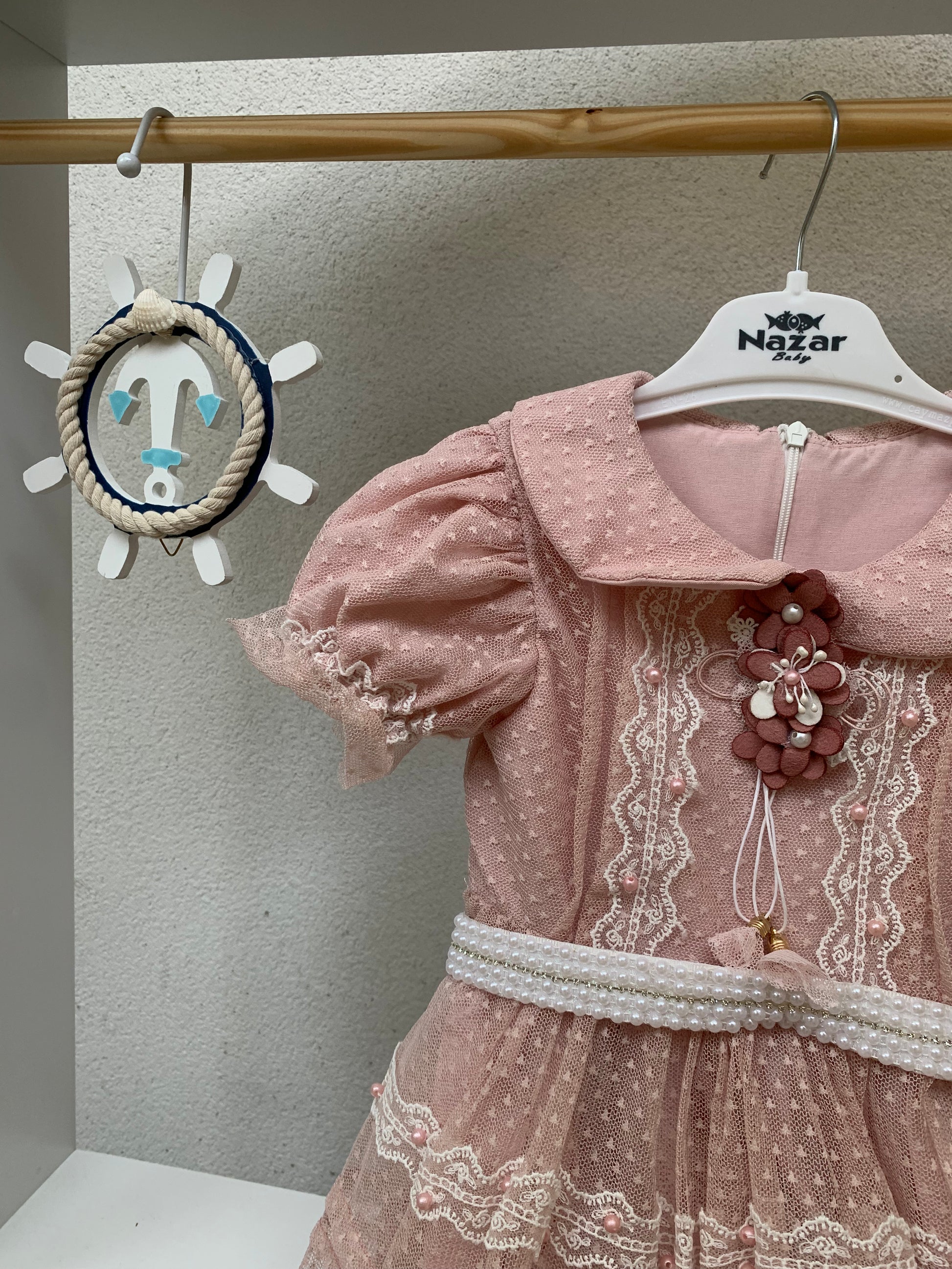 Fustan i shkurter me dantelle dhe pala. Vjen me rrip me perla ne bel dhe jake ne forme V-je. Ka material te plote dhe cilesi fantastike.