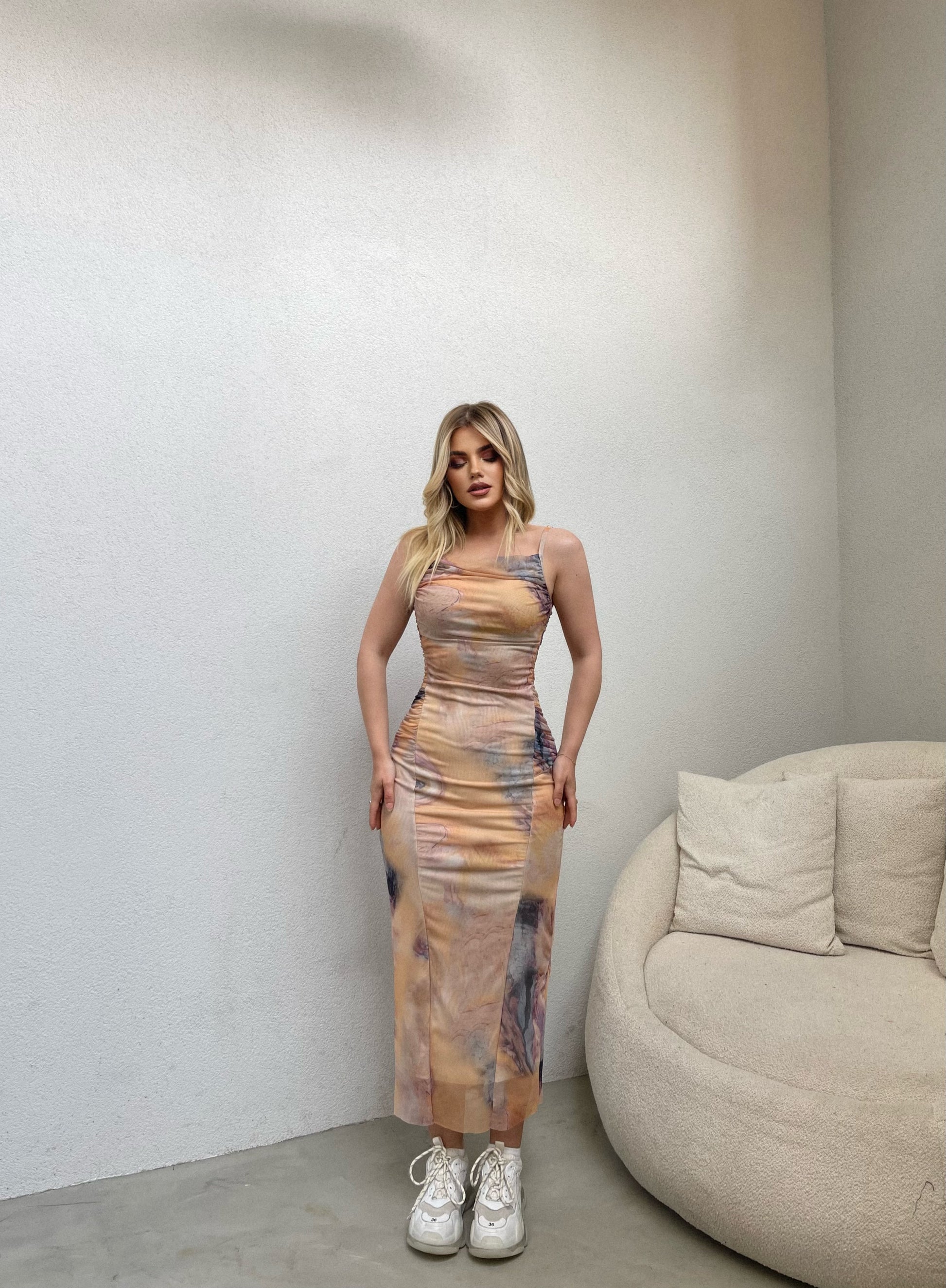 Fustan i gjate me rripa. Vjen me dizenjo ne ngjyren nude. Ka material te plote dhe cilesi fantastike.