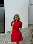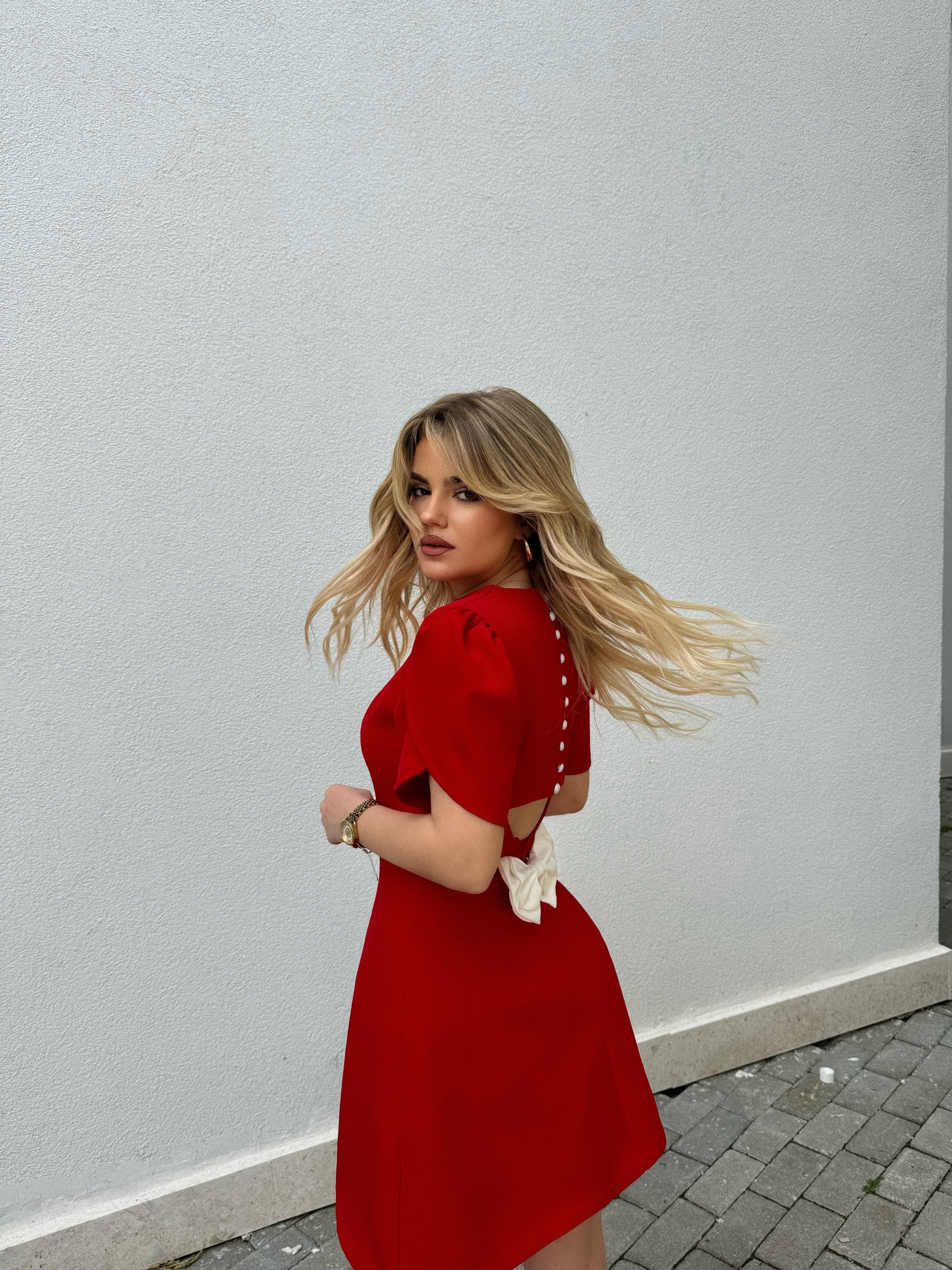 Fustan me gjatesi normale. Ka fjongo ne pjesen e pasme dhe kopsa te bardha te pjesa e kurrizit.Ka menge te shkurtra.Materiali eshte i plote dhe shume i mire