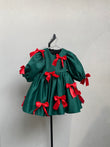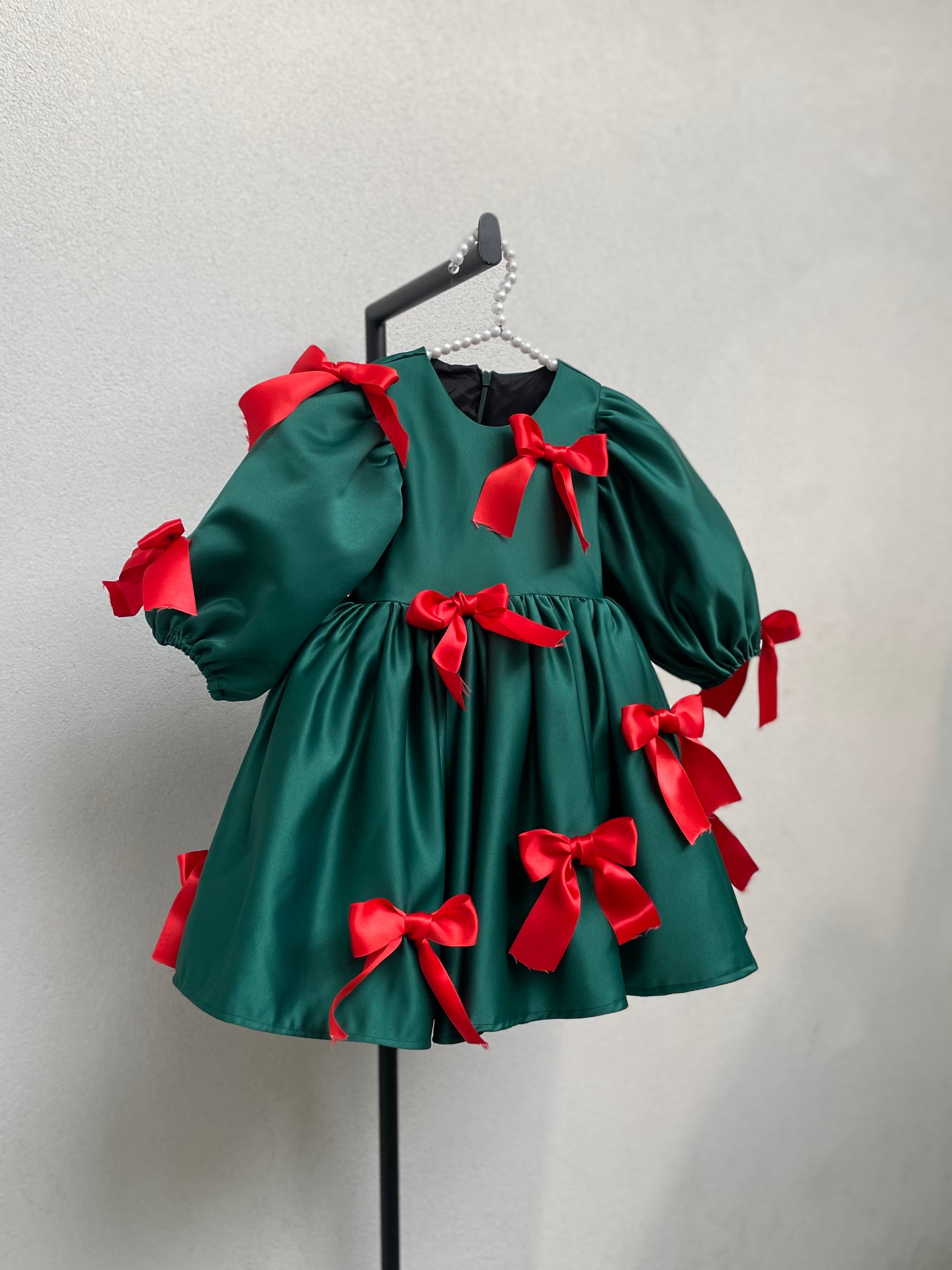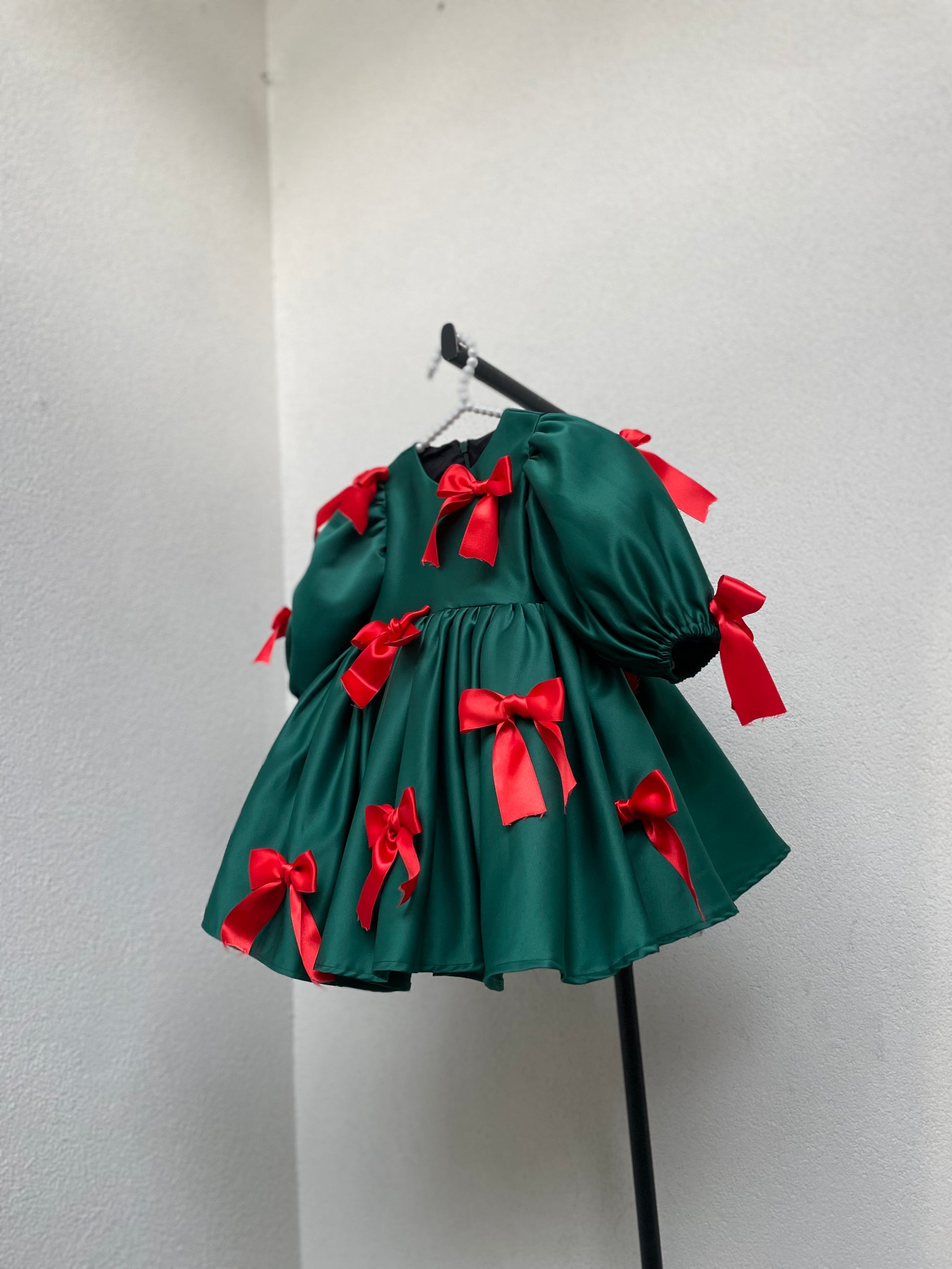 Fustan jeshil me fjongo ne ngjyren e kuqe. Eshte me menget e fryra. Super cute dhe komod. Ka material te plote dhe cilesi fantastike.