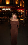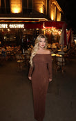 Fustan ne ngjyren kafe me gure. Vjen me pjesen e supeve jashte dhe ka astar poshte. Teper komod dhe pershtatet yll ne trup.