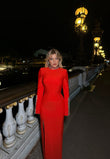 Fustan i gjate ne ngjyren e kuqe. Vjen me detaje guresh ne pjesen e jakes dhe mengeve. Ka te care ne anash dhe pershtatet yll pas trupit.
