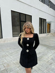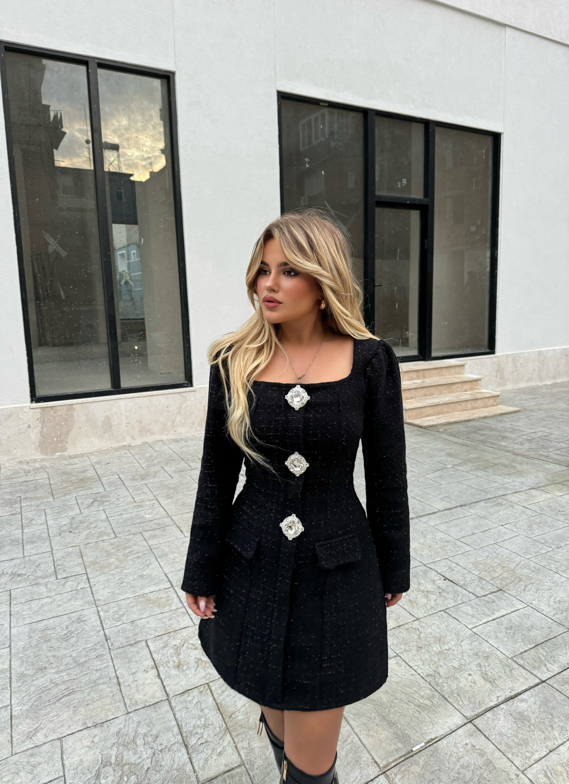 Fustan i zi. Fustan i zi me cope me xixa shkelqyese minimaliste, ka krahe te gjate por fustani vjen i shkurter me detajin e xhepave dhe kopsave gold. Material komod dhe i ngrohte.