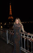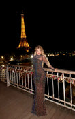 Fustan i gjate, me menge te gjata, i mbuluar plotesisht me gure vezullues. Model elegant, i ngushte ne trup,perfekt per mbremje dhe evente luksoze.