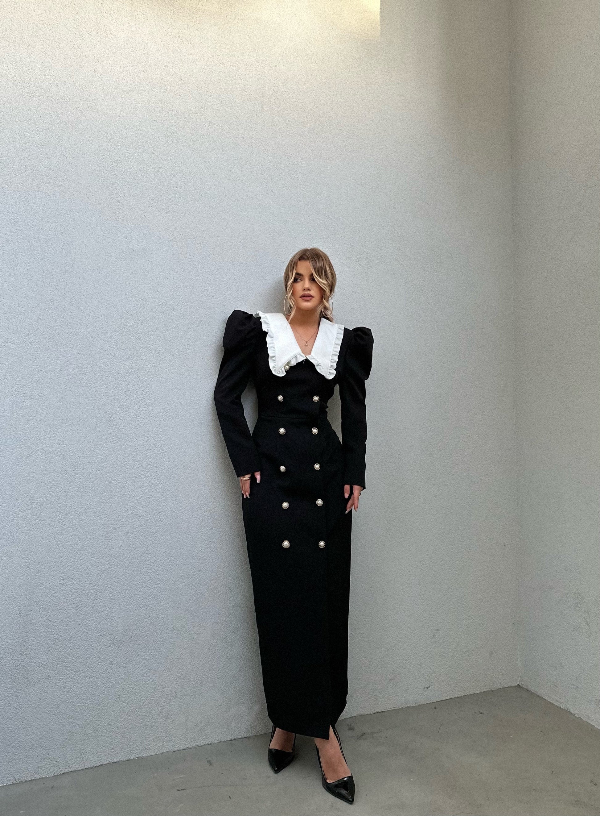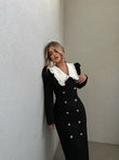 Fustan me jake te madhe te bardhe dhe kopsa para. Ka material te plote dhe cilesi fantastike. Super stil dhe teper komod.