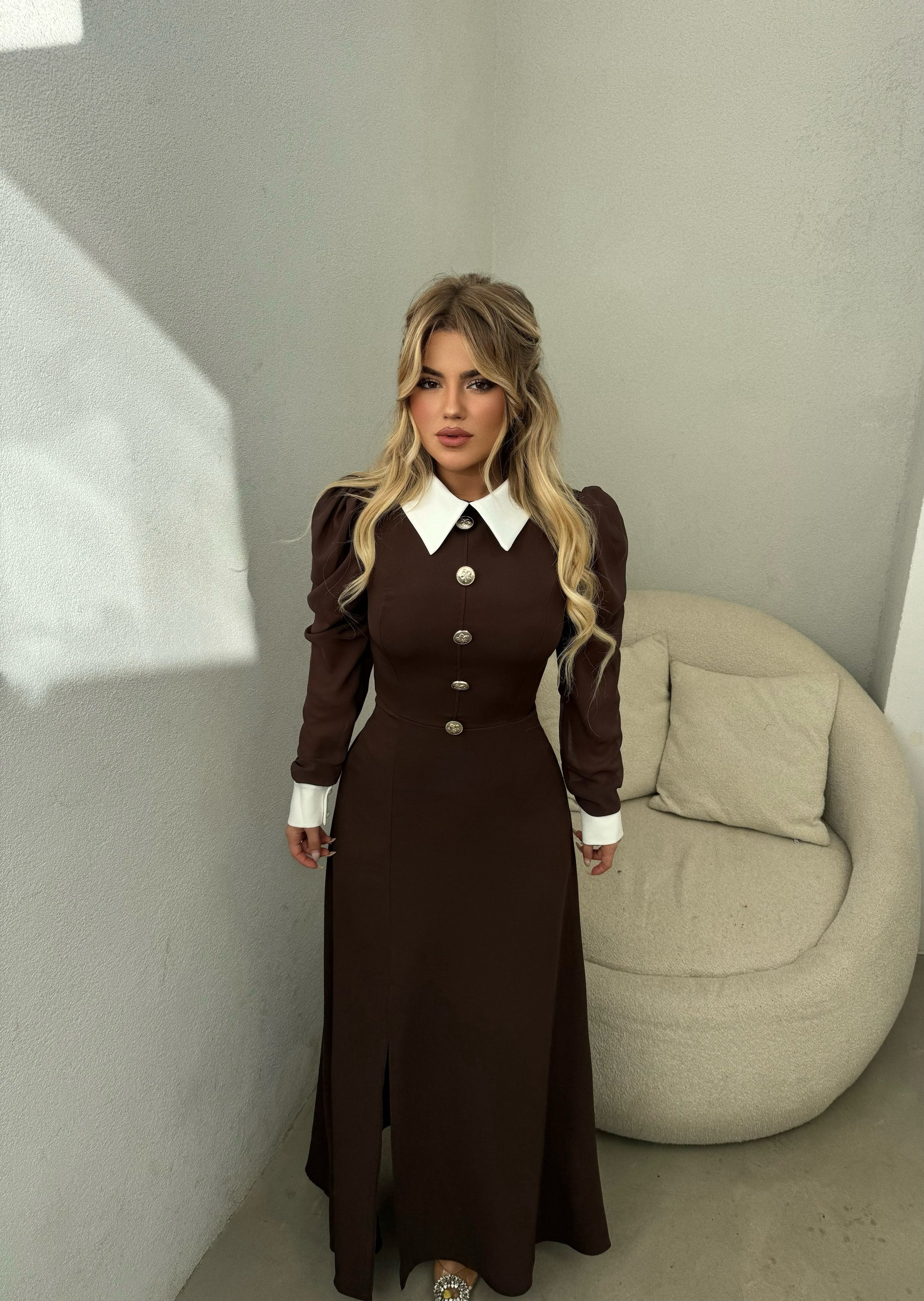Fustan ne ngjyren e kafe, ne pjesen e Jakes eshte ne ngjyren e bardhe, eshte me kopsa gold perpara. Material i plote dhe i bute. Lehtesishte i kombinueshem.