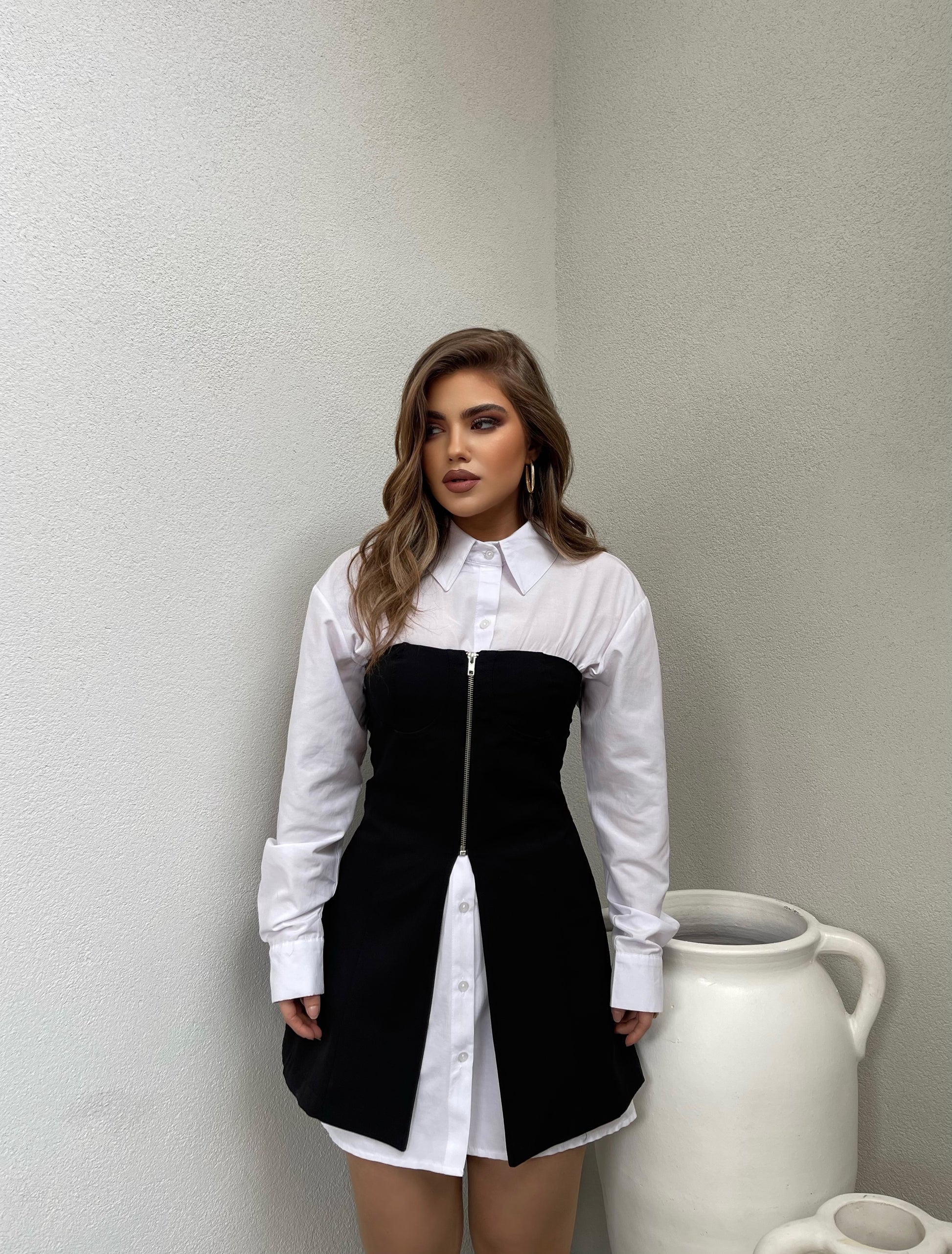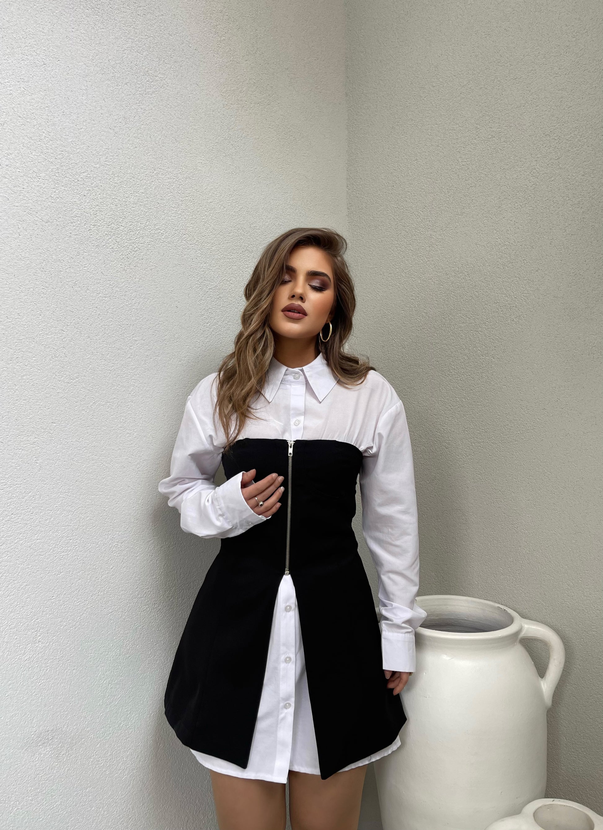 Fustan i zi i shkurter me kemishe te bardhe. Mberthimi behet me ane te zinxhirit ne pjesen perpara dhe kopsave te kemishes. Super stil dhe material fantastik.