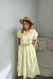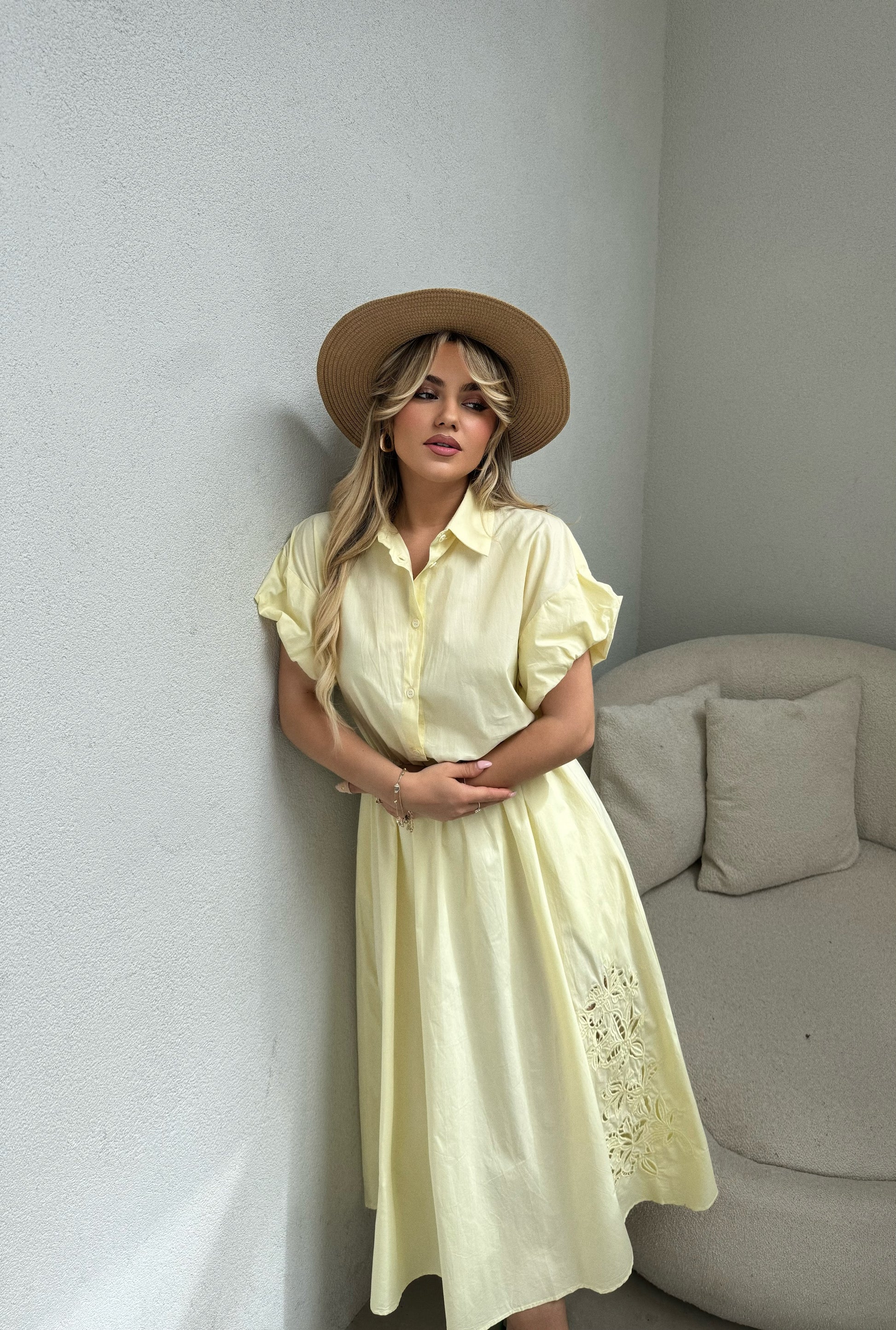 Fustan i gjate me kopsa para. Eshte me llastik ne bel dhe detaje me lule tek jaka. Ka material te plote dhe cilesi fantastike.