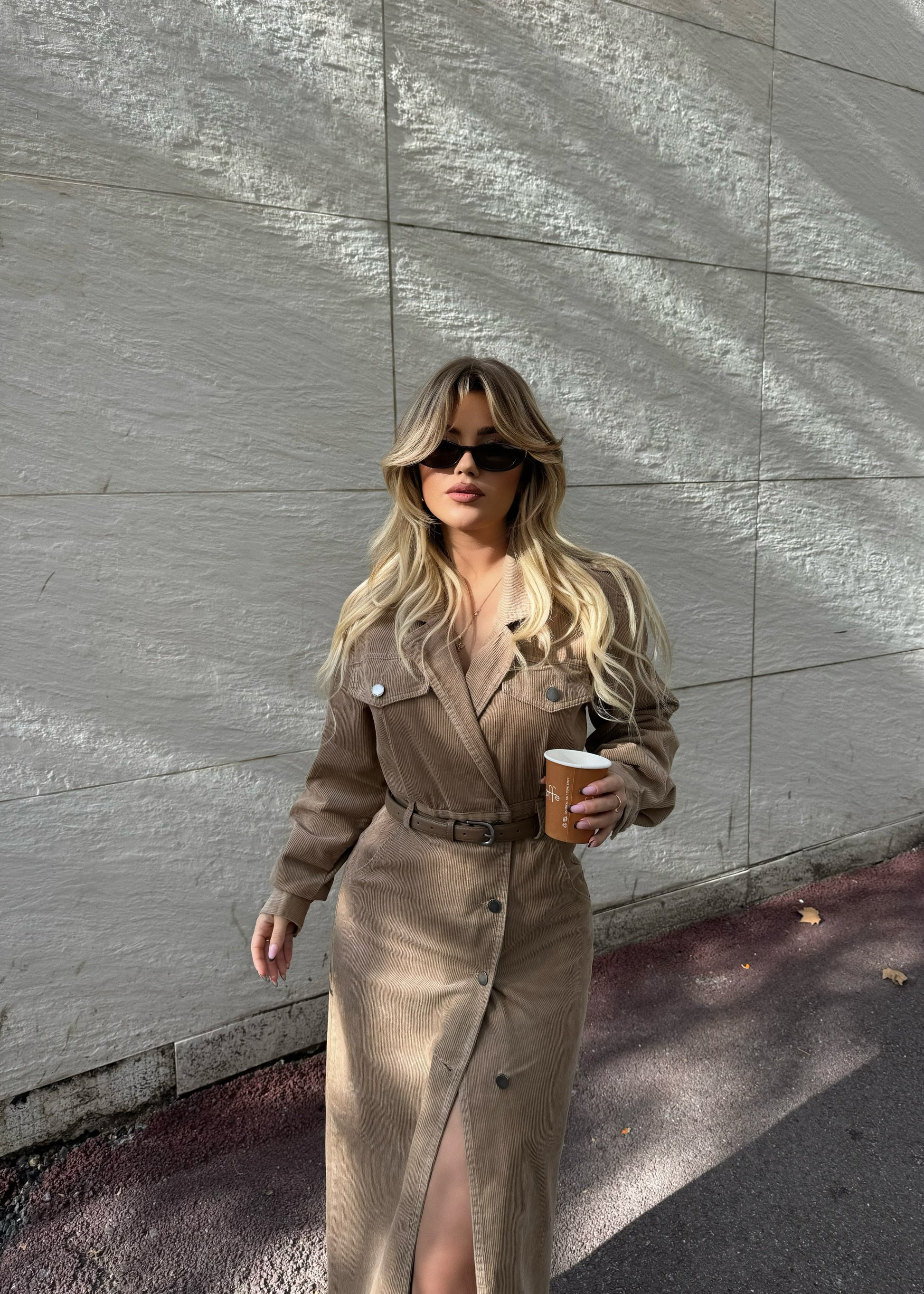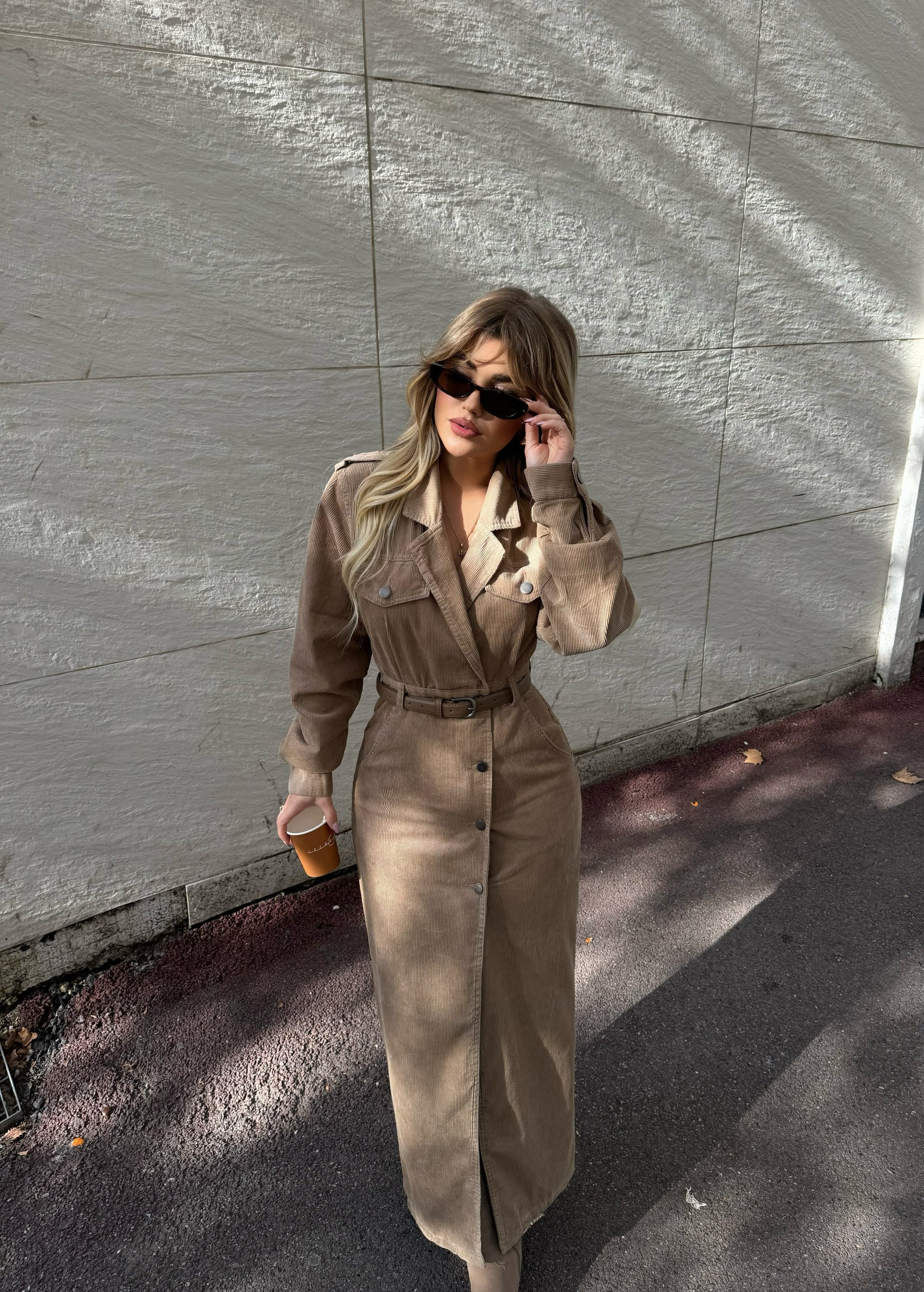 Fustan i gjatë me stil xhakete, me kopsa në pjesën e përparme dhe rrip që thekson belin. Ka prerje elegante në formë pardesyje, i përshtatshëm si për përditshmëri ashtu edhe për raste të veçanta.