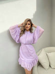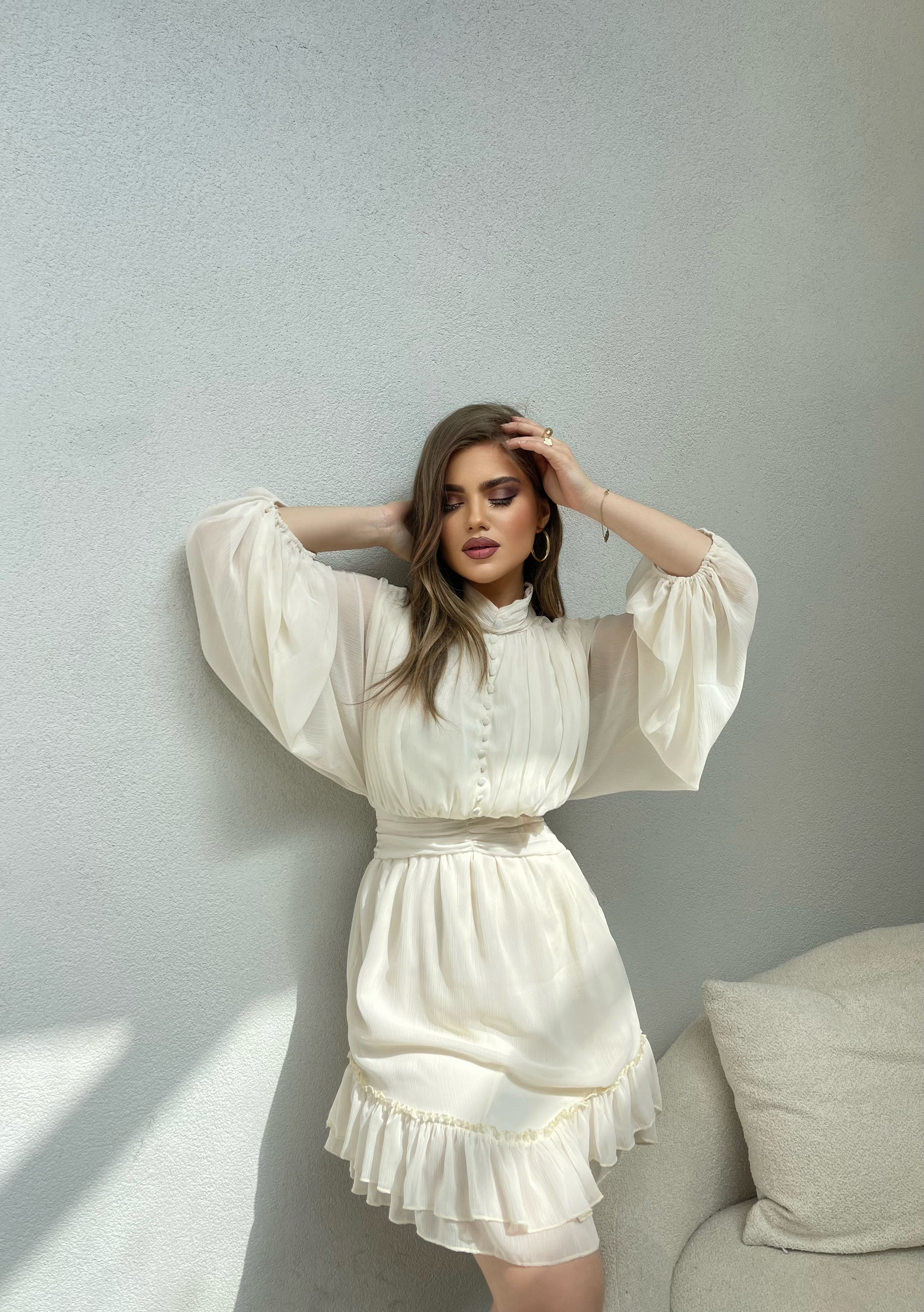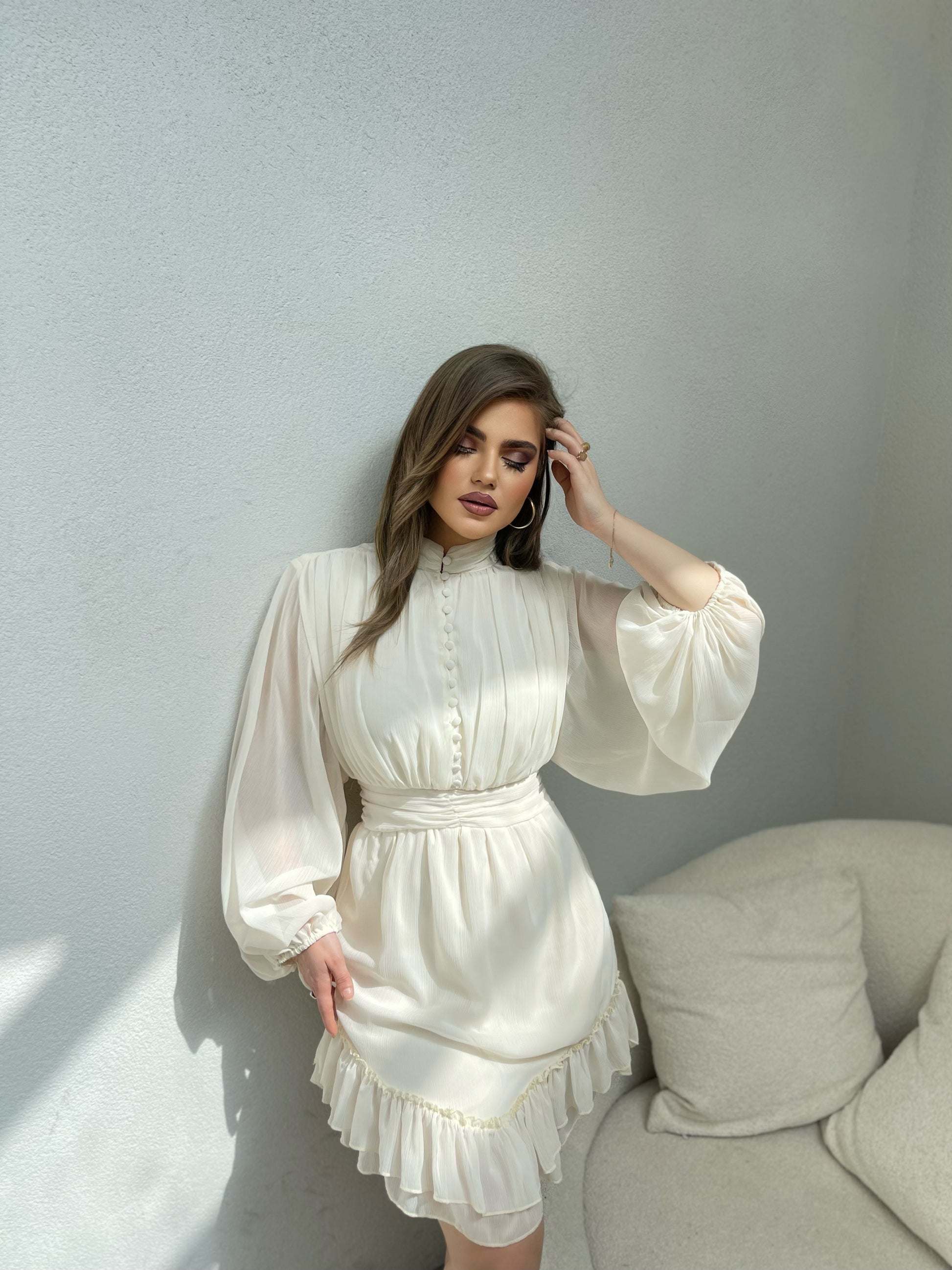 Fustan me kopsa te vegjel ne pjesen perpara. Jaka vjen ne forme rrethore. Ka rrip ne pjesen e belit dhe llastik ne pjesen e fundit te mengeve. Gjatesi normale dhe prerje te rregullt. Materiali eshte i plote dhe ka cilesi fantastike.