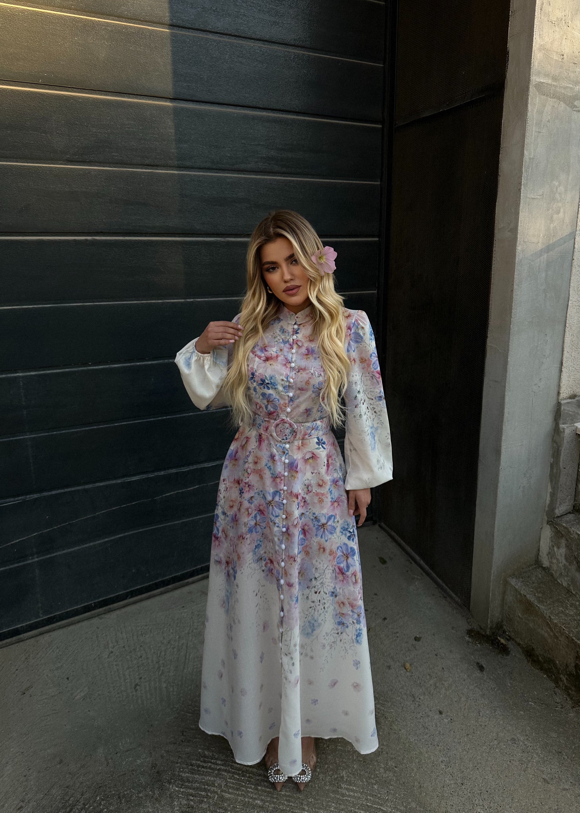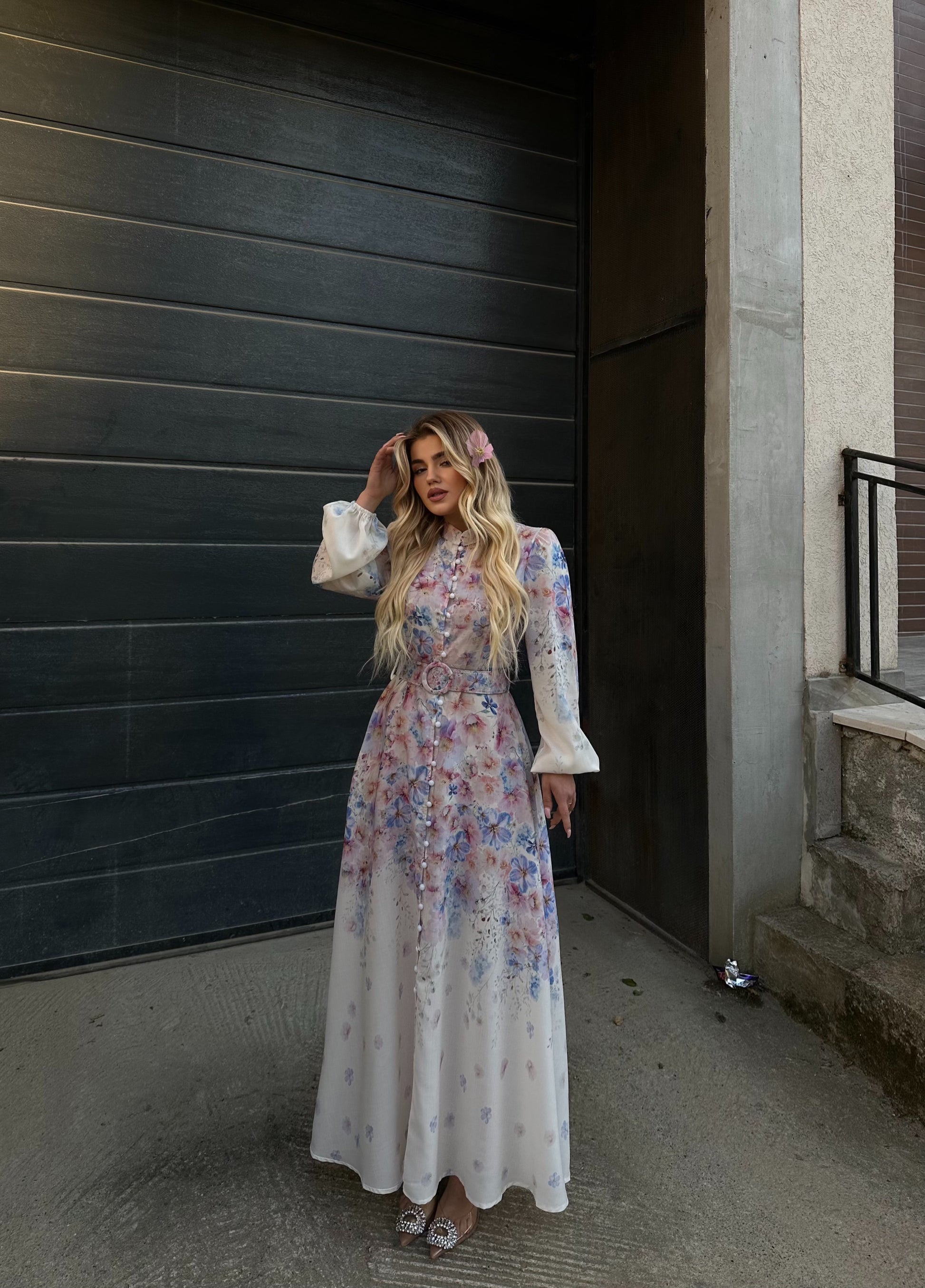 Fustani me lule vjen me menge te gjata, ka detajin e kopsave ne pjesen para vjen bashke me rripin ne bel. Material i plote cilesi fantastike.