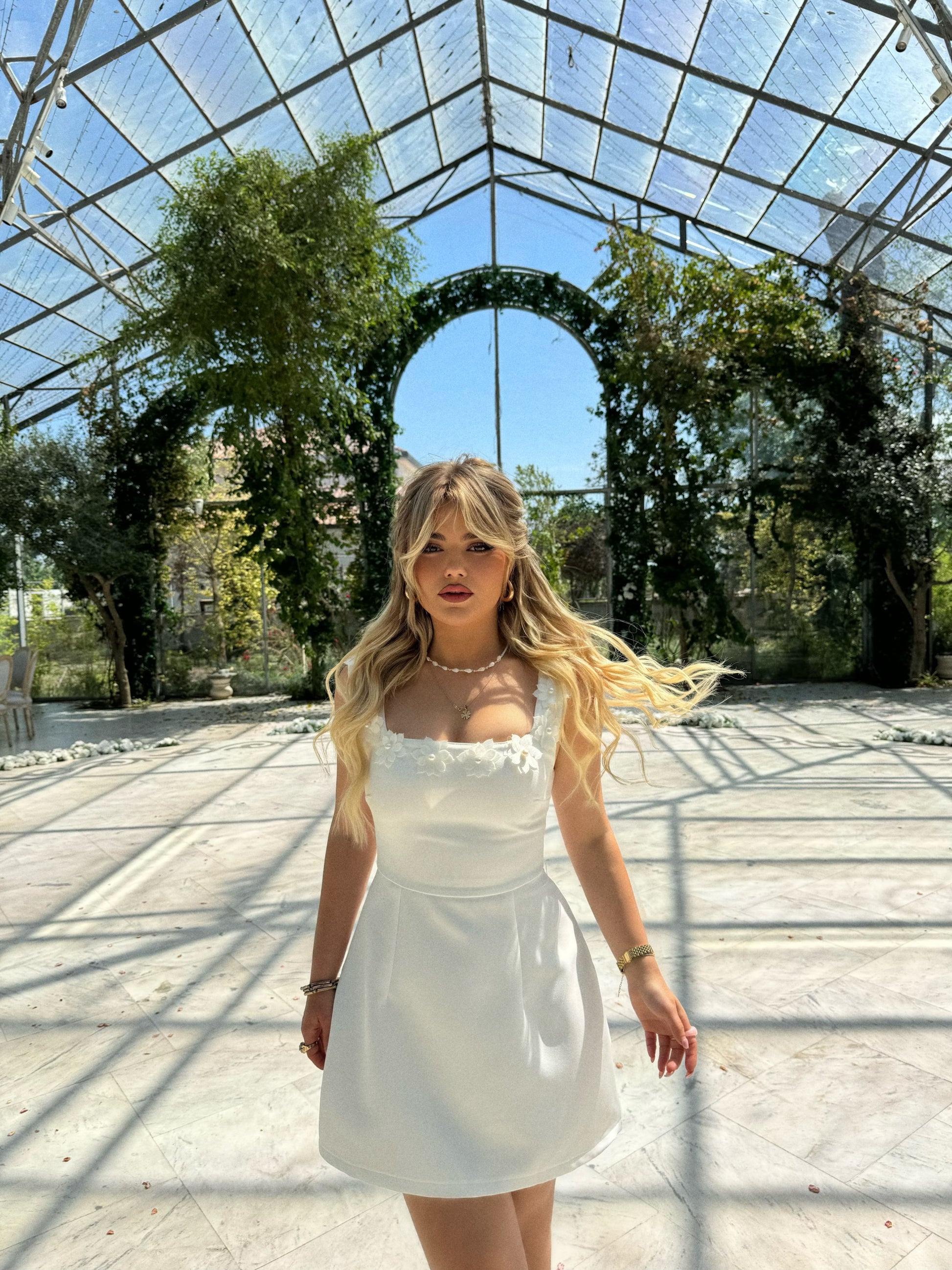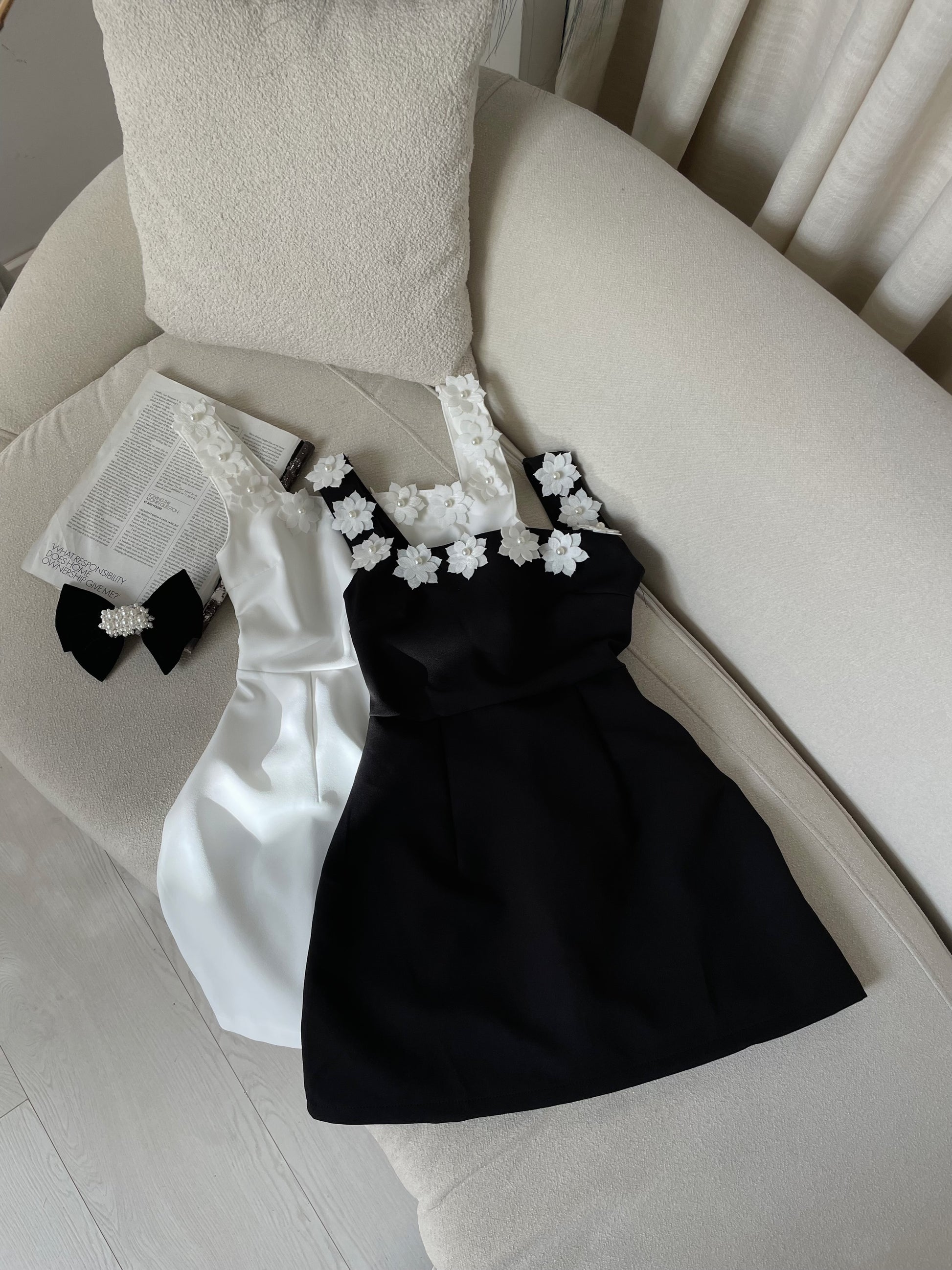 Fustan i shkurter me detaje me lule ne pjesen para. Eshte i thjeshte dhe i vecante. Eshte ne ngjyren e bardhe dhe te zeze. Ka material te plote dhe cilesi fantastike.
