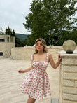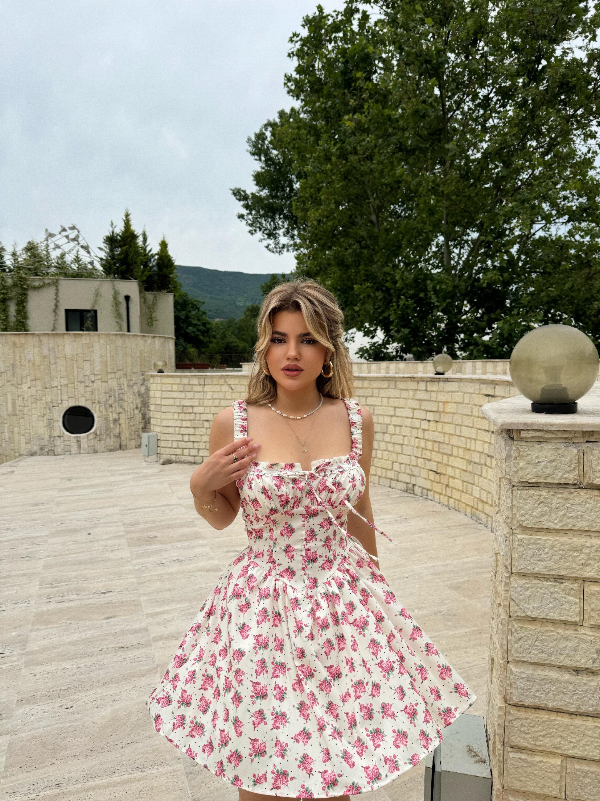 Fustan i shkurter me lule. Eshte me lidhje ne pjesen e bustit. Ka material te plote dhe cilesi fantastike.
