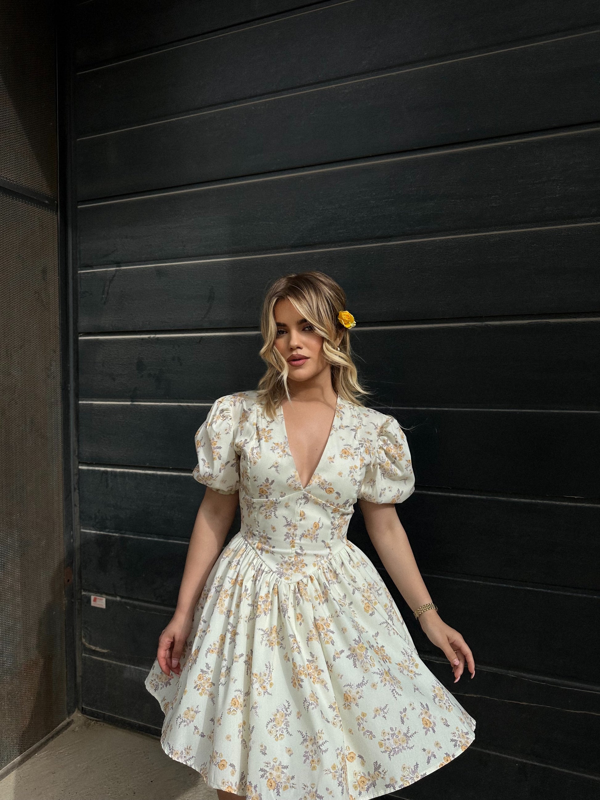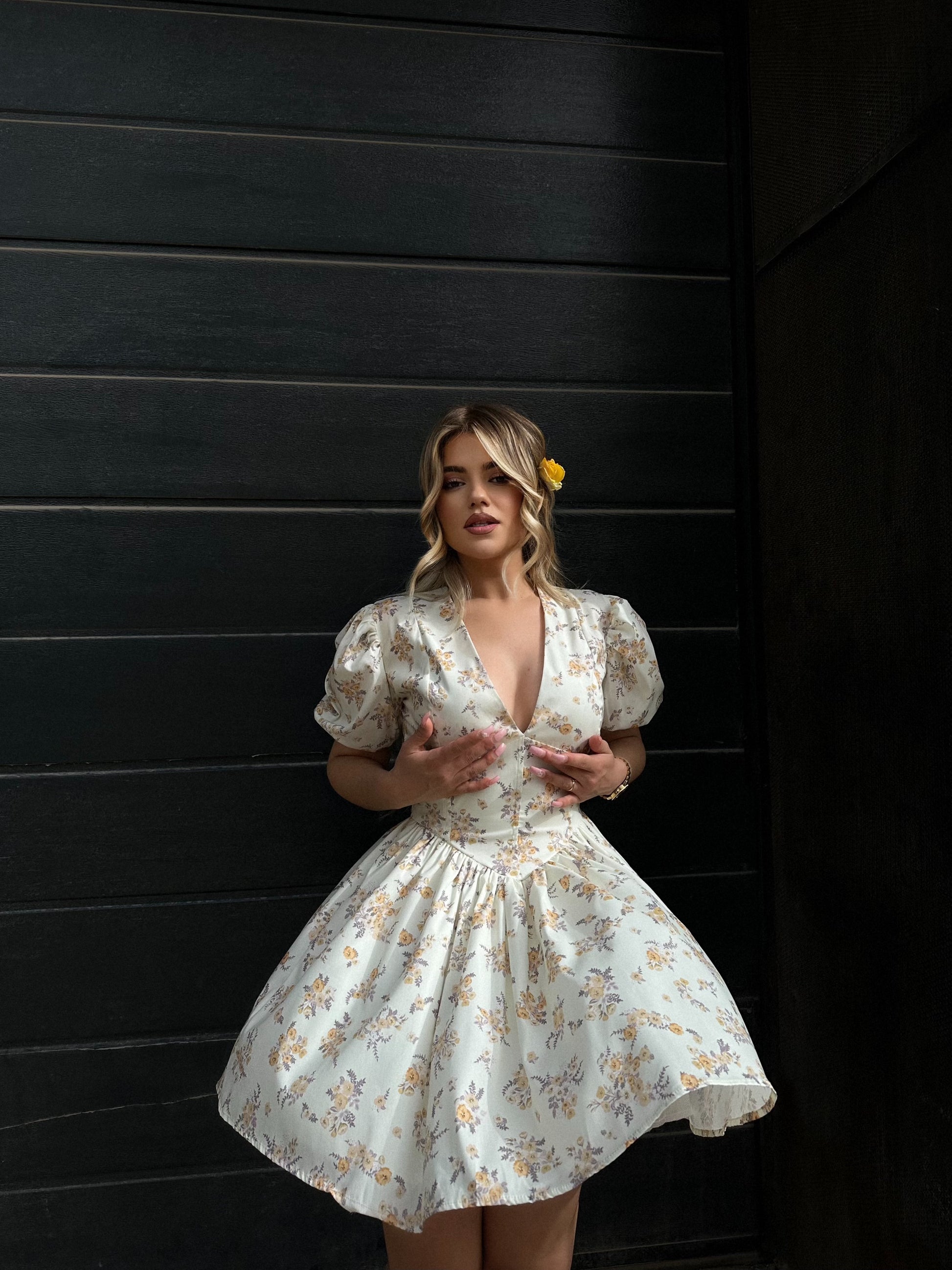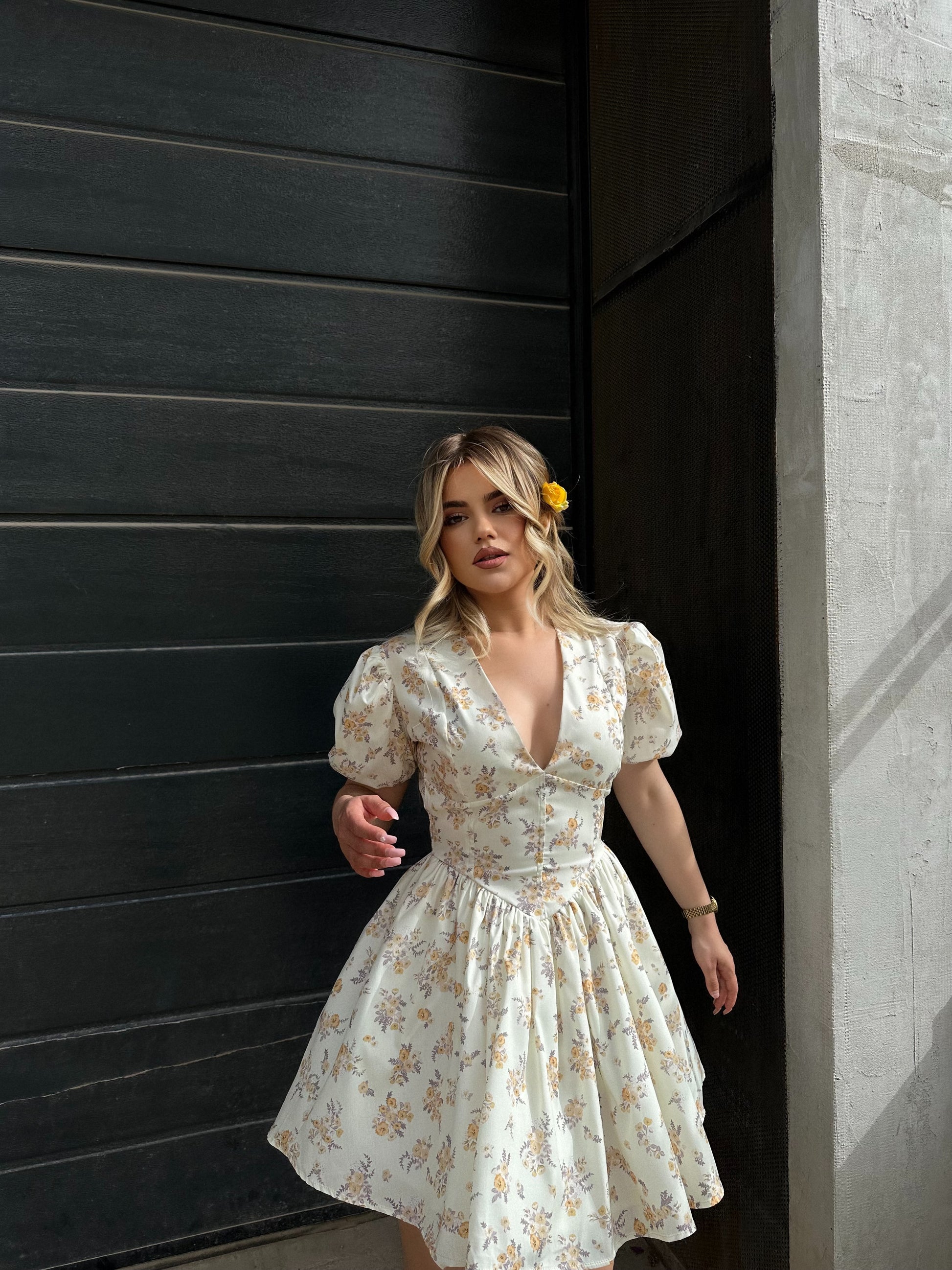 Fustan i shkurter me lule te vogla. Vjen me menge te fryra dhe me jake ne forme V-je.Material i plote.