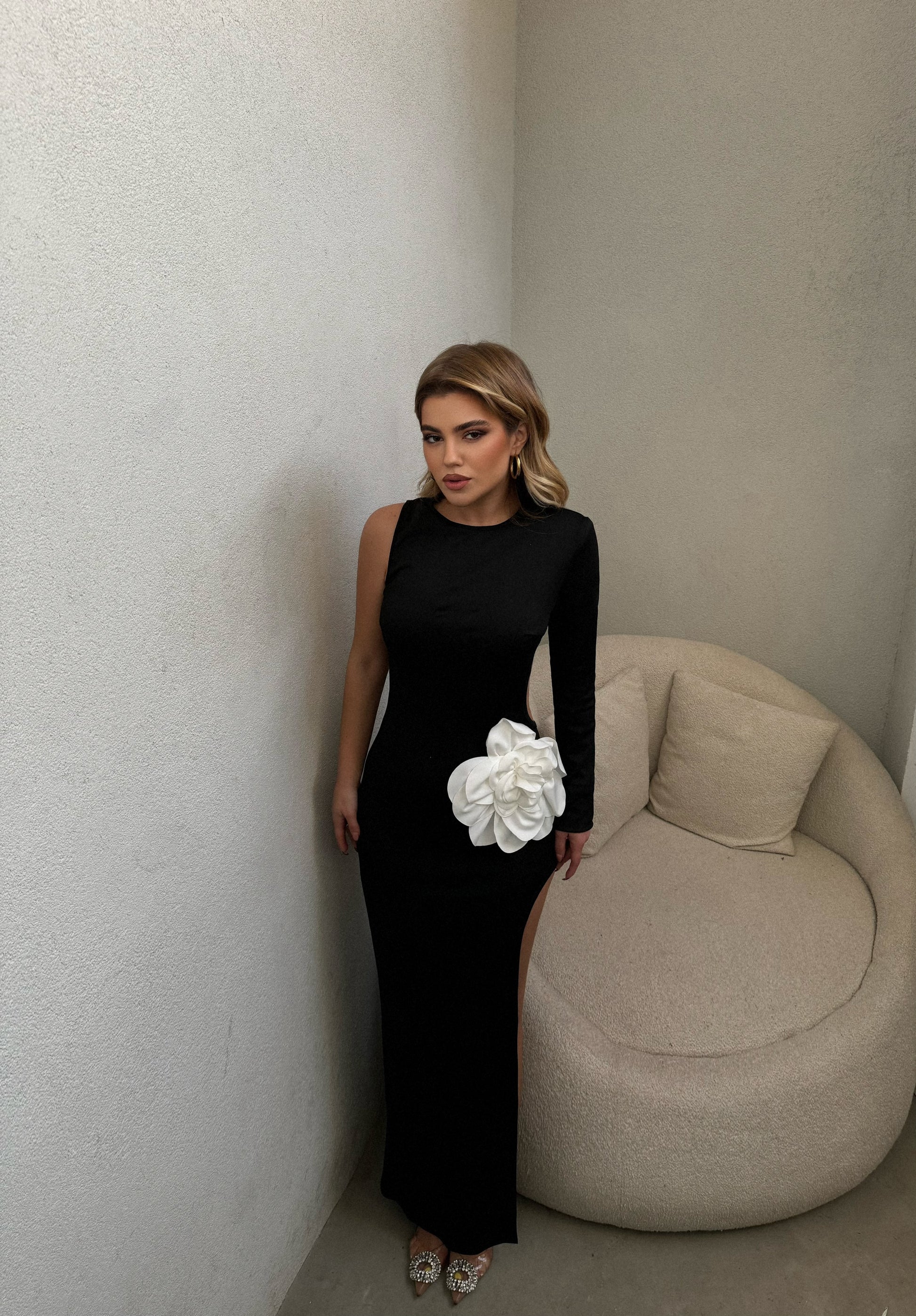 Fustan i gjate me nje menge. I hapur ne pjesen e belit dhe me lule ne bel. Eshte i care ne fund.