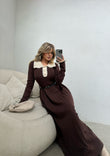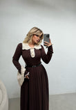 Fustan i gjate me pala ne ngjyren kafe. Shume elegant ,vjen me detaje dantelle te bardhe , kopsa si perla ne jake dhe menge. Material i plote, teper komod ne trup.