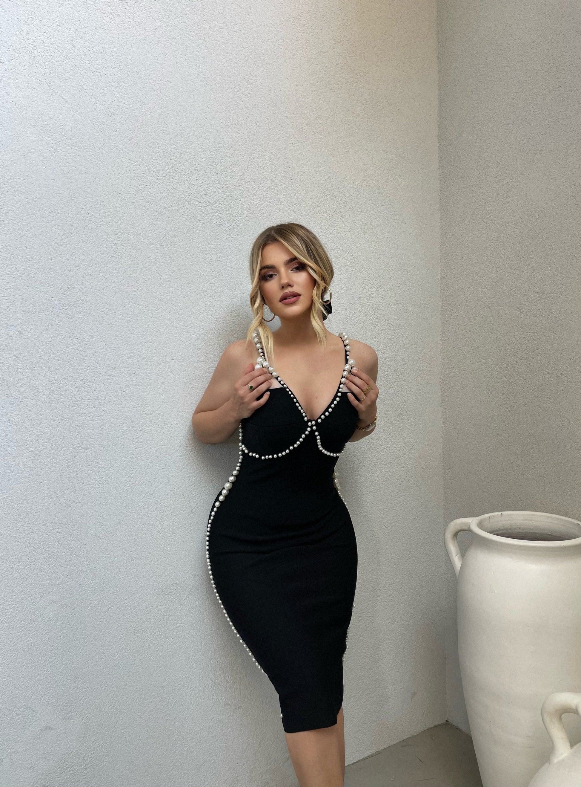 Fustan me perla anash .Eshte material i plote,cilesor dhe qendron bukur ne trup.Vjen me rripa dhe eshte trecereksh.