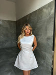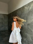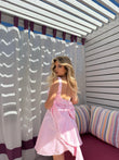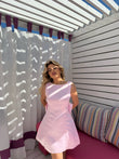 Fustan i shkurter me perla tek jaka dhe mbrapa. Eshte me shpinen e hapur dhe detaje me fjongo. Ka material te plote dhe cilesi fantastike.
