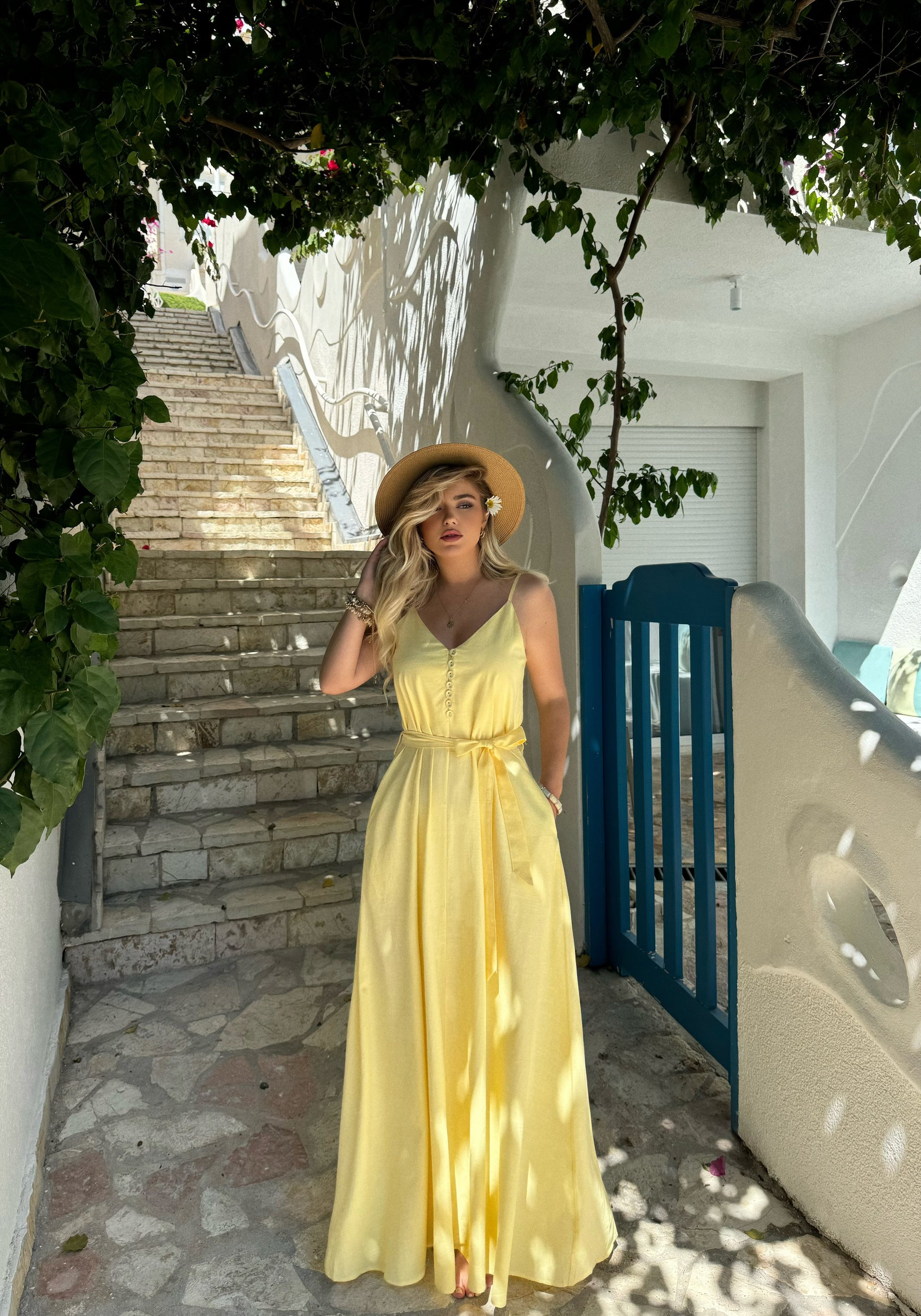 Fustan i gjate me rripa. Eshte me rrip ne bel dhe kopsa tek pjesa e bustit. Ka material te plote dhe cilesi fantastike.