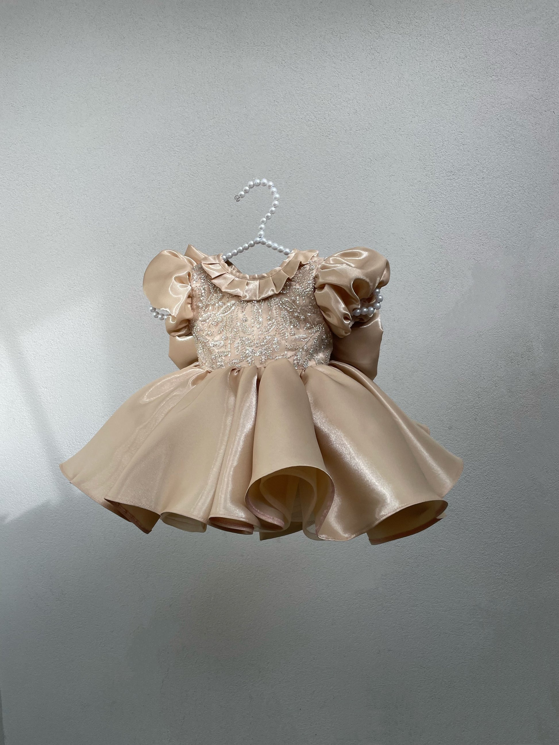 Fustan me pala dhe detaje me gure ne pjesen e bustit. Ka shume shkelqim dhe eshte me fjongo ne pjesen mbrapa. Material i plote dhe cilesi fantastike.