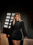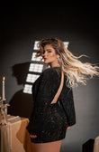 Fustan i shkurtër në ngjyrë të zezë, me temina që i japin shkëlqim dhe elegancë. Ka shpinën e hapur, duke krijuar një pamje elegante dhe festive,perfekt për mbrëmje dhe evente speciale.