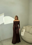 Fustan ne ngjyren kafe eshte me supe jashte. Material i plote dhe i bute. Teper stil dhe elegante.