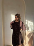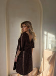 Fustan i shkurtër me temina në ngjyrë kafe, me fjongo elegante në pjesën e pasme. Modern, femëror dhe ideal për evente speciale.
