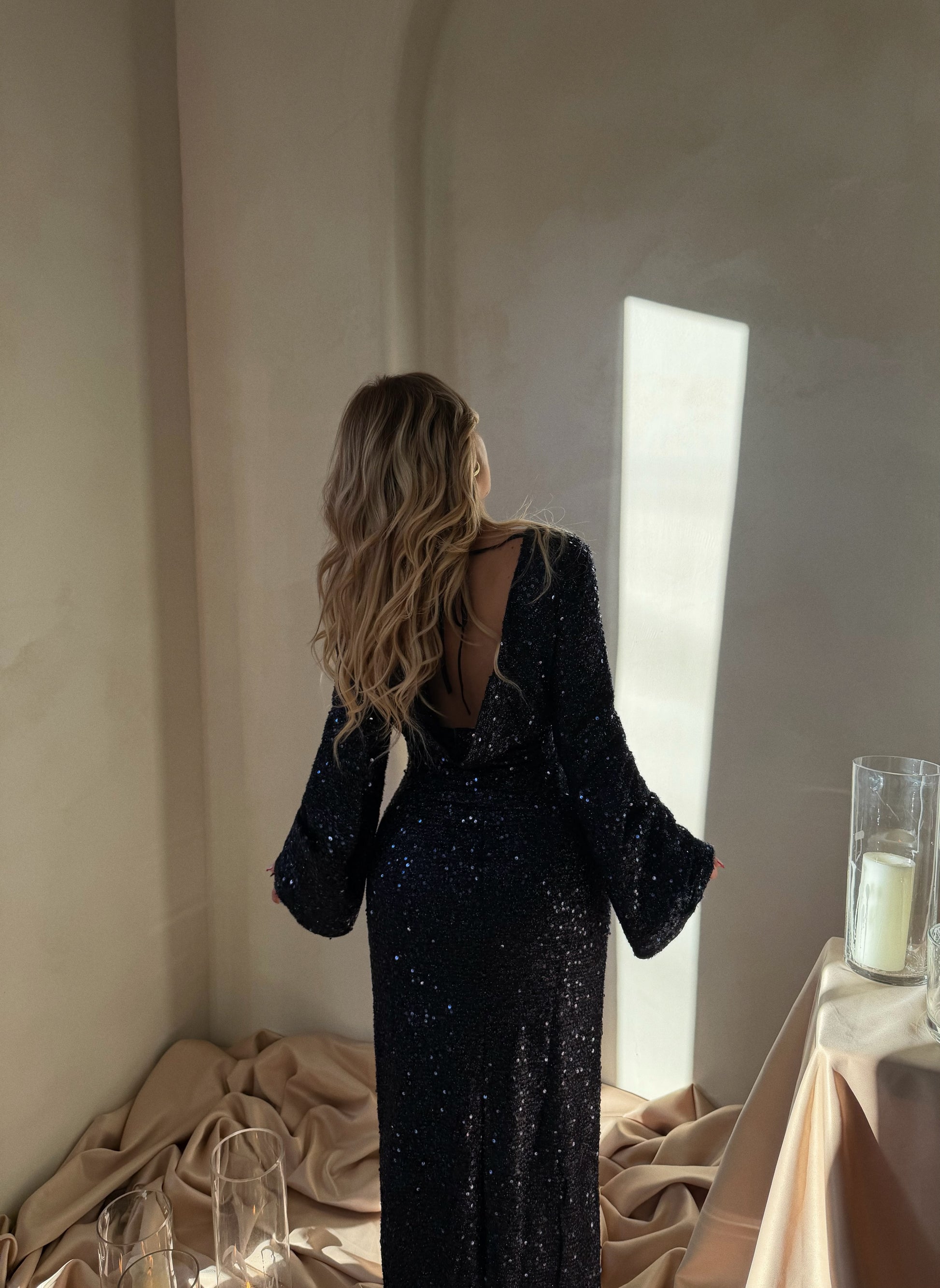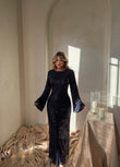 Fustan i gjatë në ngjyrë të zezë me mëngë të gjata, i dekoruar me temina që i japin shkëlqim dhe elegancë. Ideal për mbrëmje dhe evente speciale.