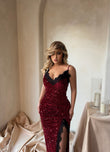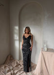 Fustan i gjate, i veshur me temina, permban rripa praktik ne bust me elemente te dantelles se holle, dhe nje e care ne njeren ane te kembes.