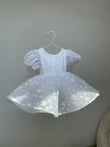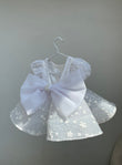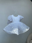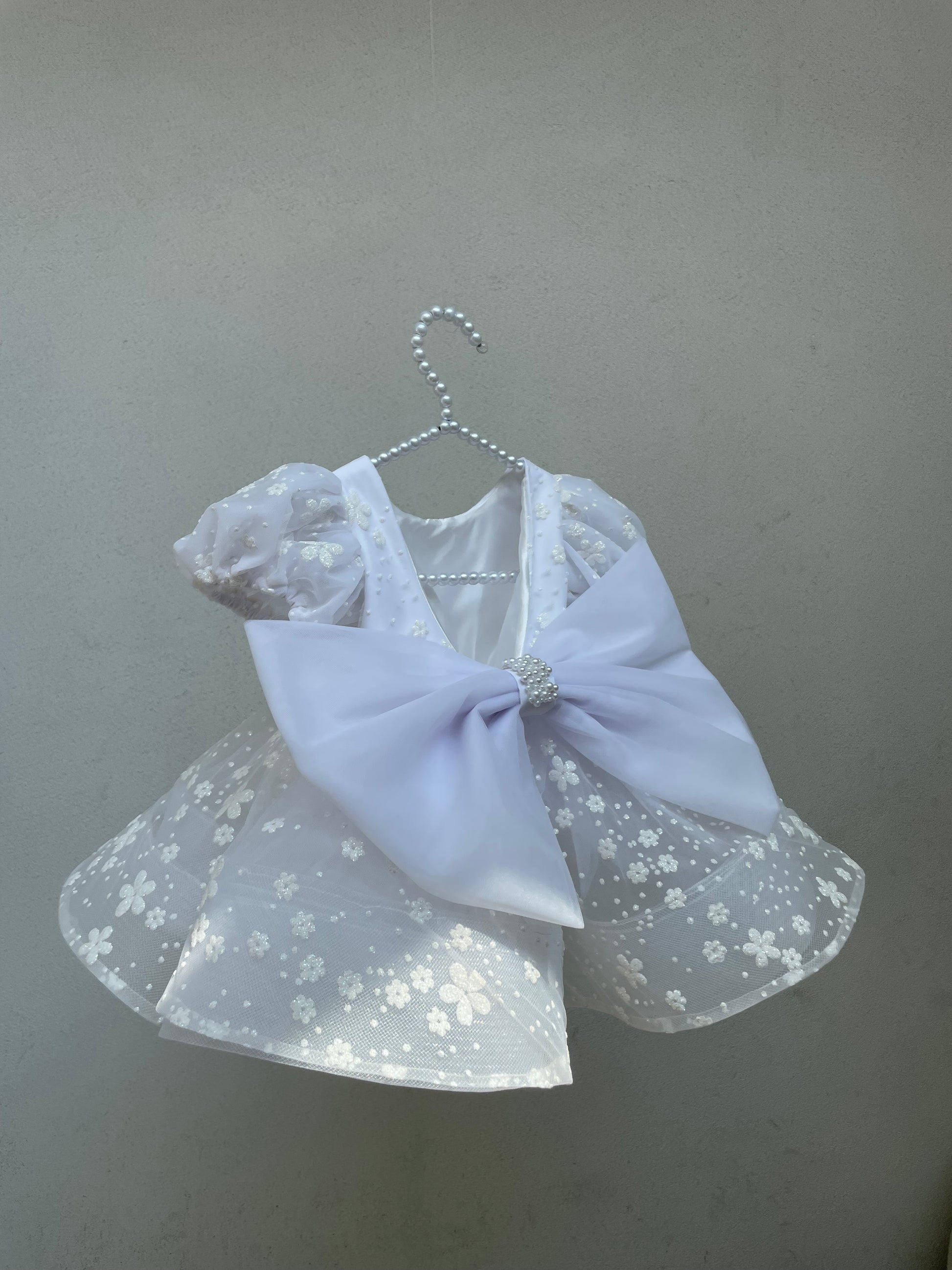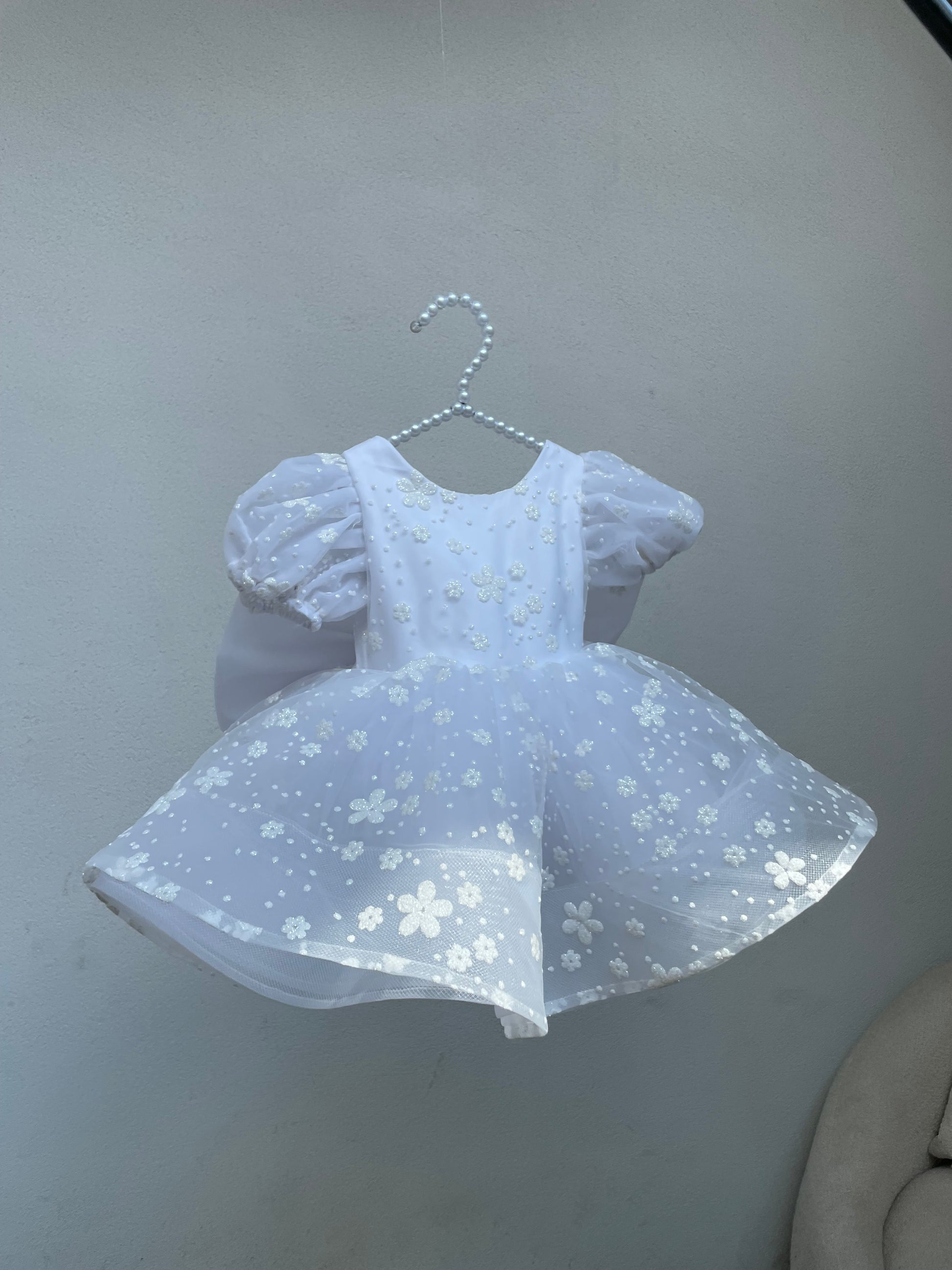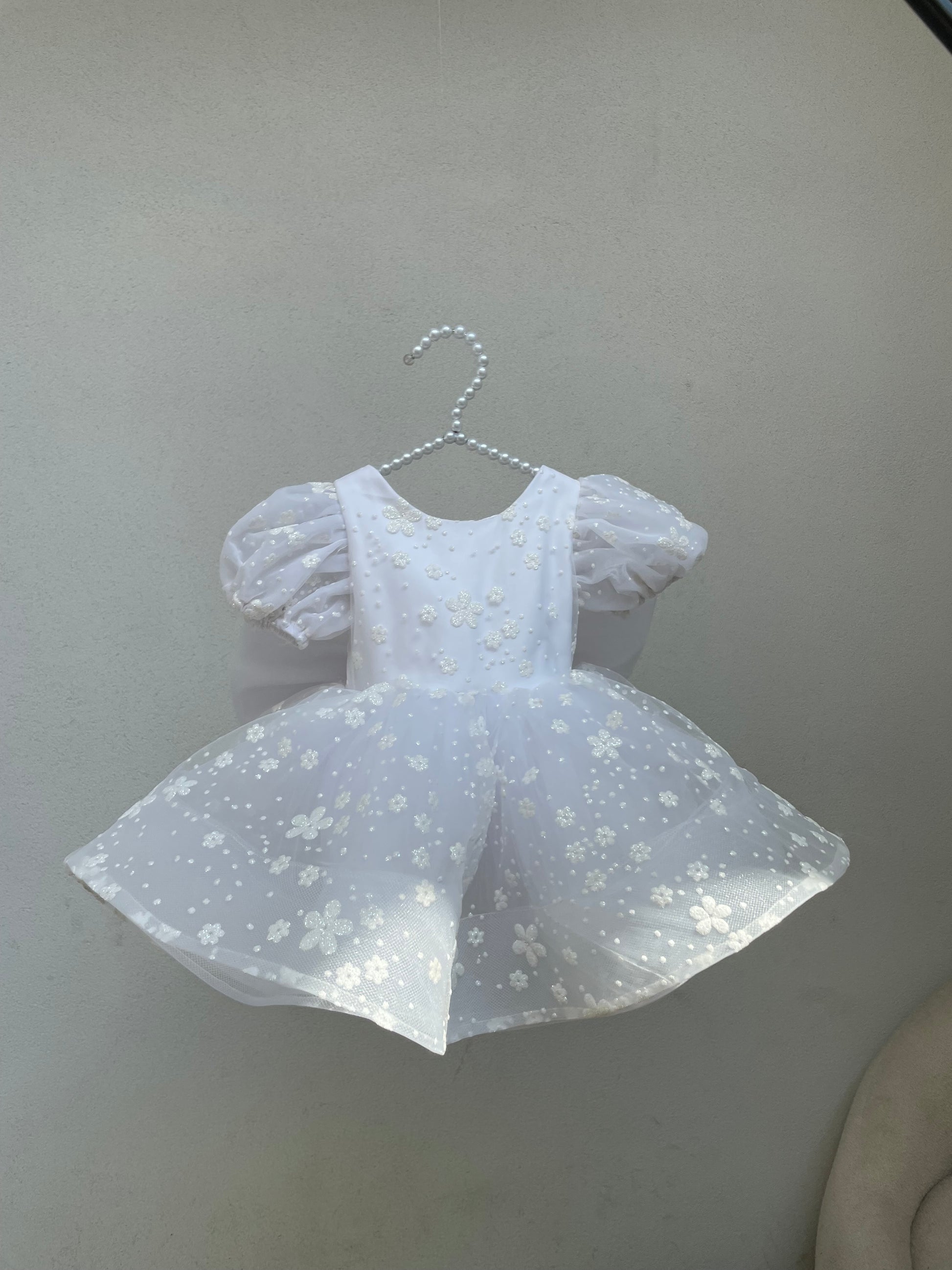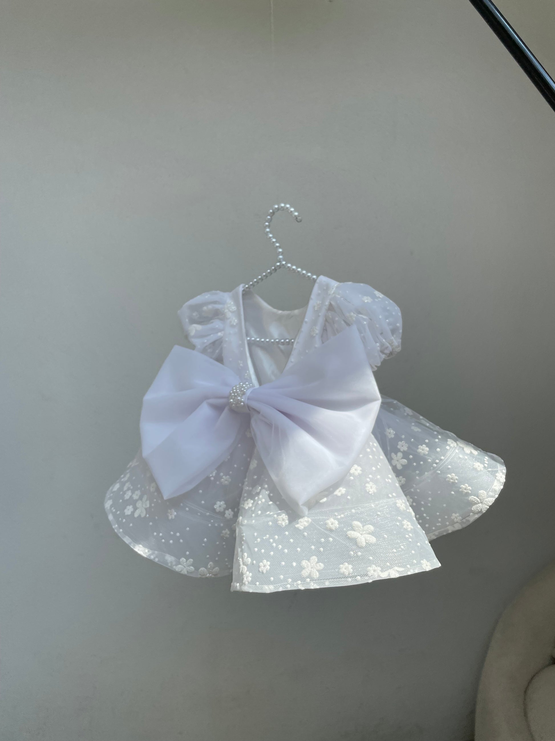 Fustan i shkurter me detaje me lule me xixa. Eshte i hapur ne pjesen mbrapa dhe ka nje fjongo me perla. Material i plote dhe cilesi fantastike.