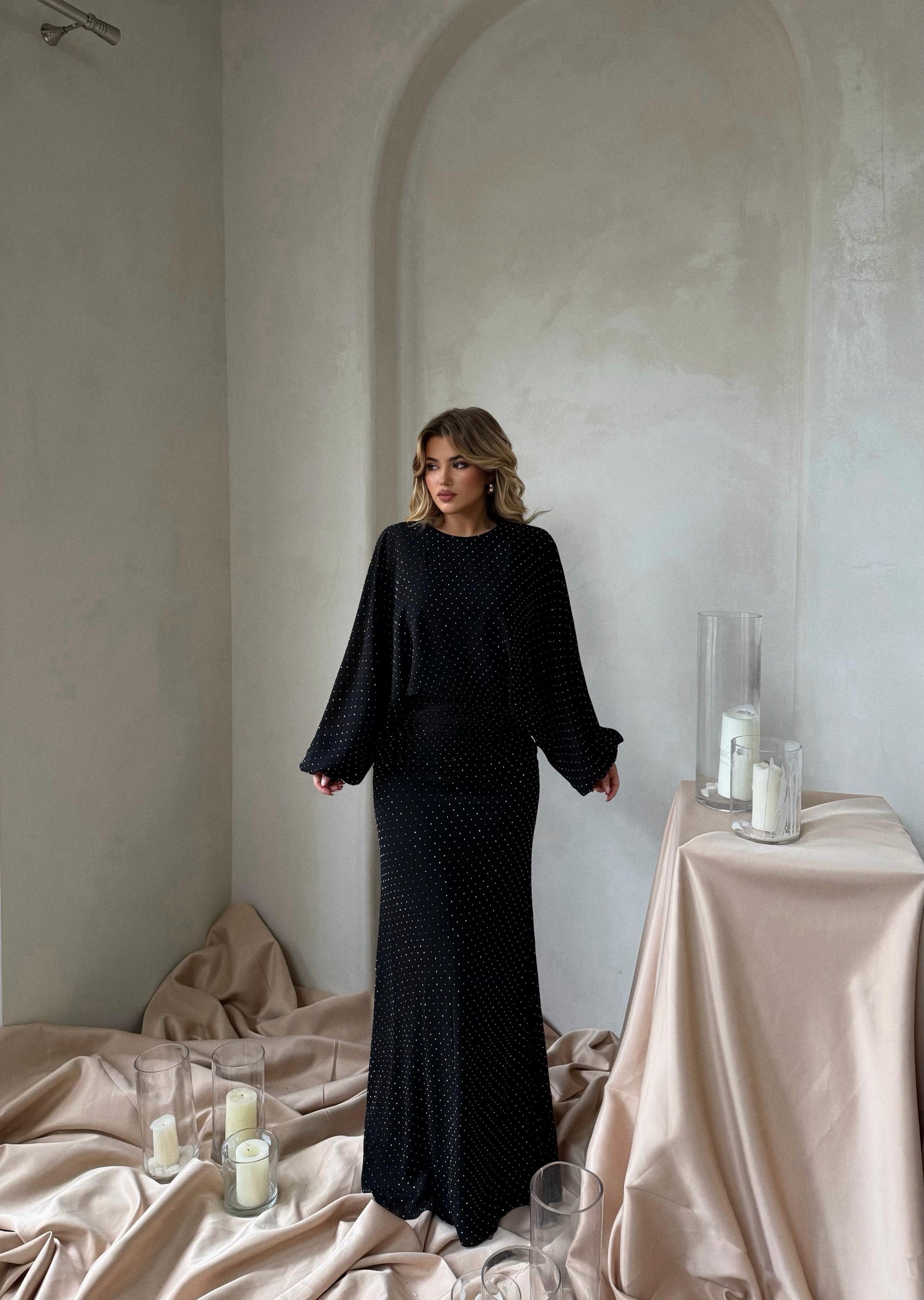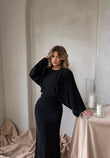 Fustan i zi i gjatë me xixa, që ofron një pamje elegante dhe glamuroze. Ka krahë të gjera dhe të fryra, të cilat i japin stil unik dhe modern. Ideal për mbrëmje festive dhe evente speciale