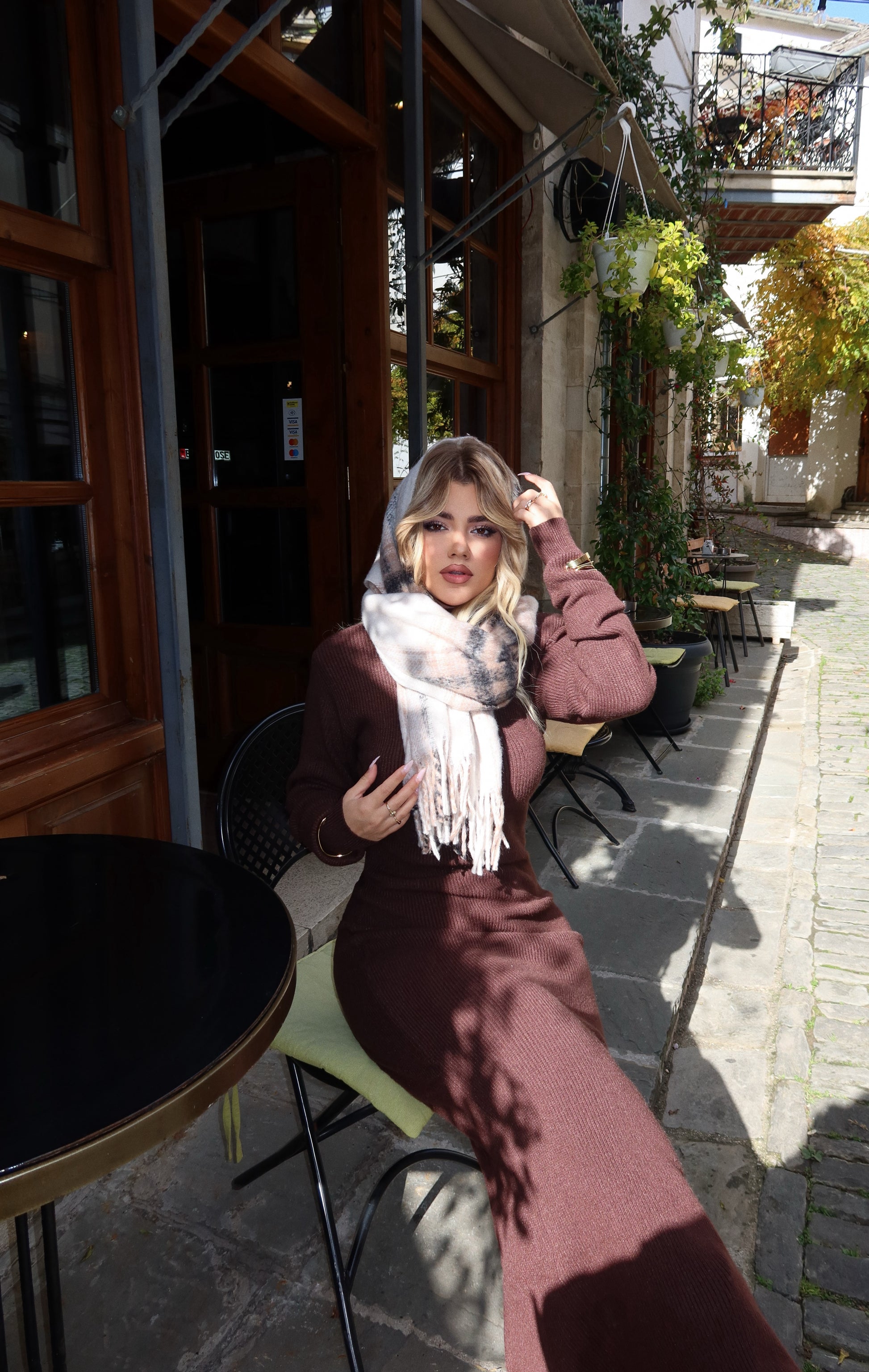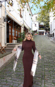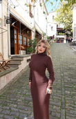 Fustan ngjyre kafe. Material pambuk i bute dhe i rehatshem, vjen i gjate me krah te gjate dhe gjysme golf praktik. Model i thjesht dhe komod.