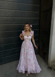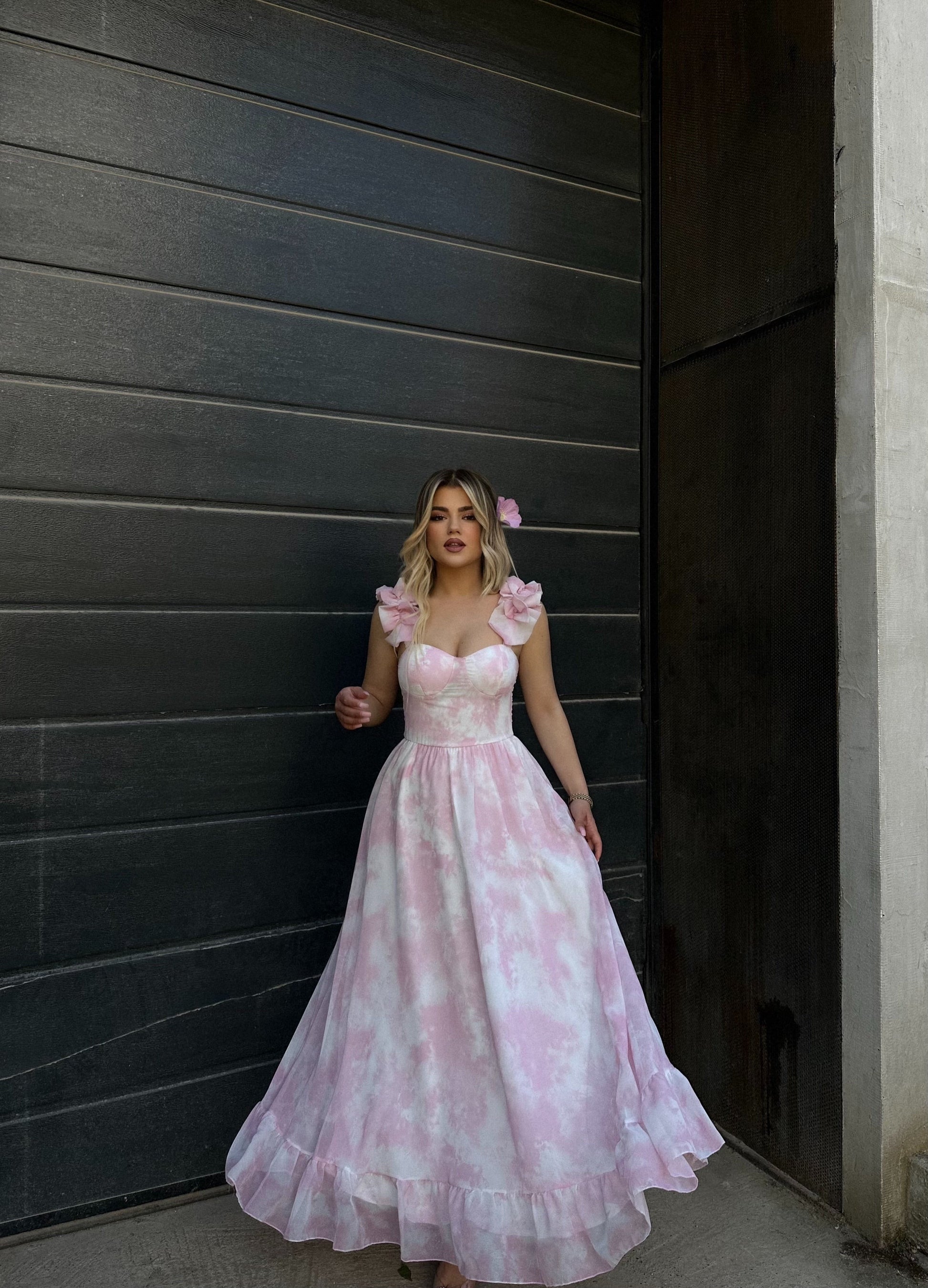 Fustan pastel, vjen me pala ne pjesen e fundit te fustanit. Fustani ka detajin e rripave ne forme fluture. Material i plote super stil.