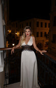 Fustan i gjate sateni ngjyre e bardhe me brez dantelle të zeze ne bel dhe dekolte ne forem V. Elegant dhe femerore.
