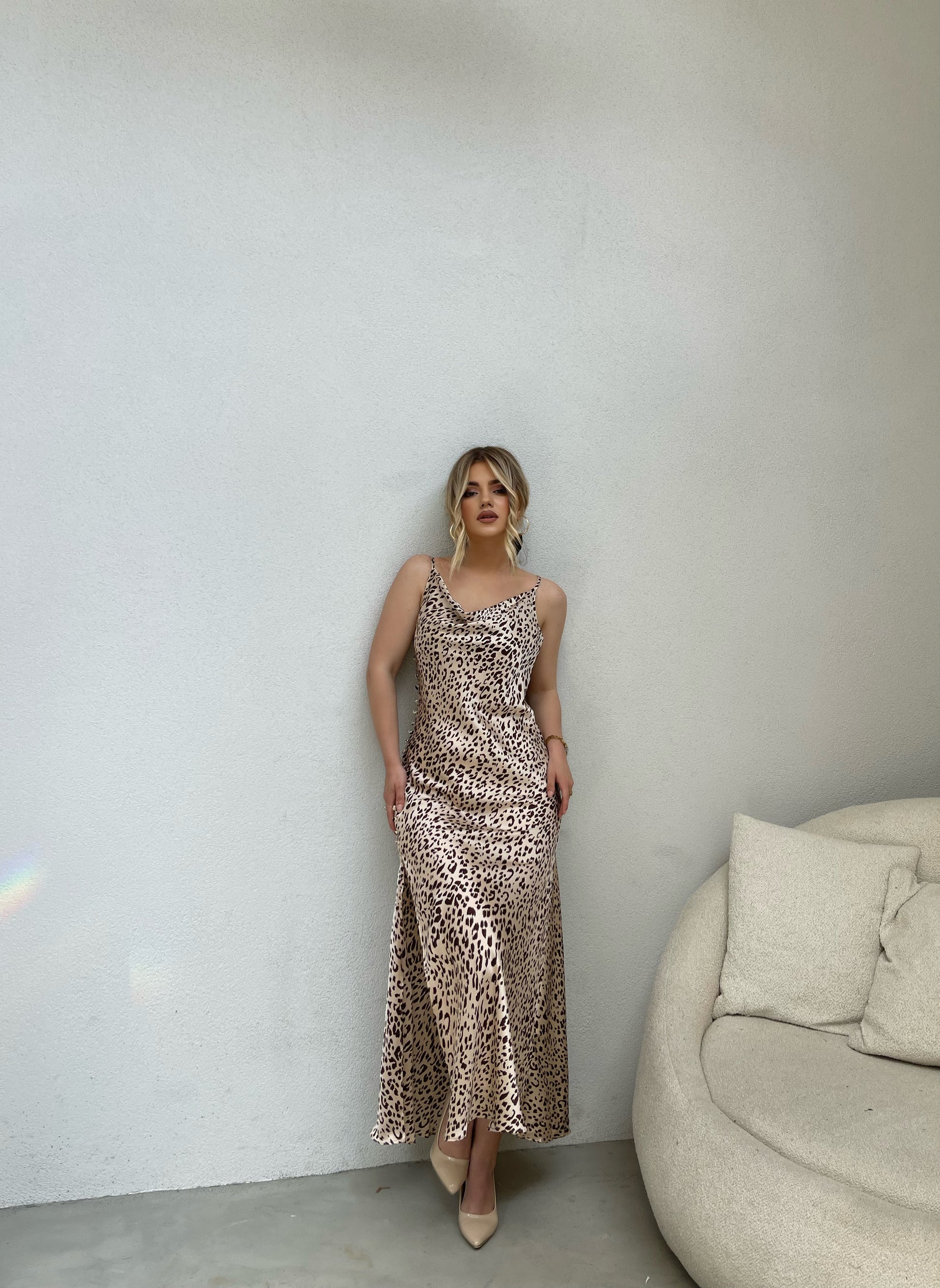 Fustan saten me dizenjo leopardi. Vjen me rripa dhe eshte i care anash. Ka material te plote dhe cilesi fantastike.