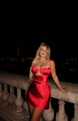 Fustan i shkurter saten me kupa tek pjesa e bustit. Mbyllet me zinxhir nga pas. Me rripa. Busti vjen ne formen e guaskes.