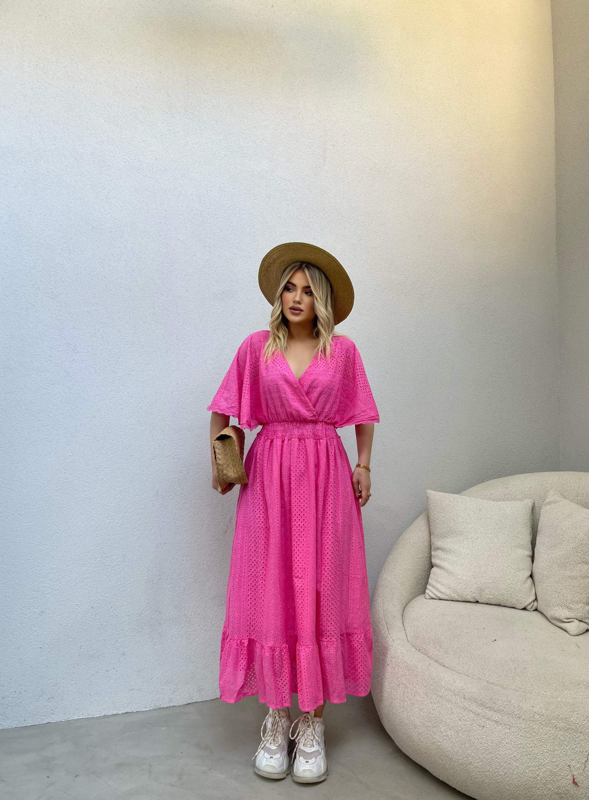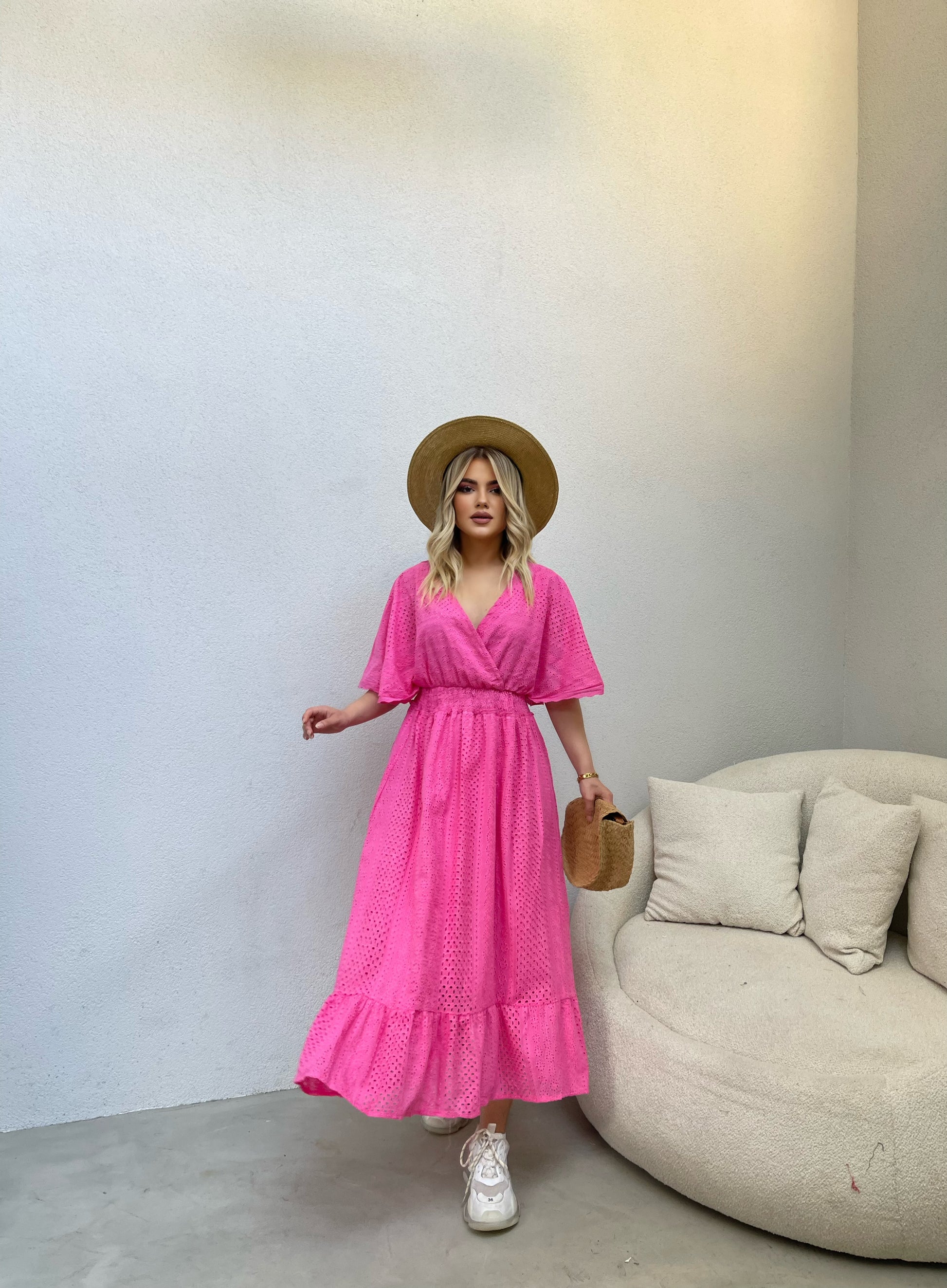 Fustan trecereksh me krahe si flutur. Vjen me llastik ne bel dhe me dantelle. Ka material te plote dhe cilesi fantastike.