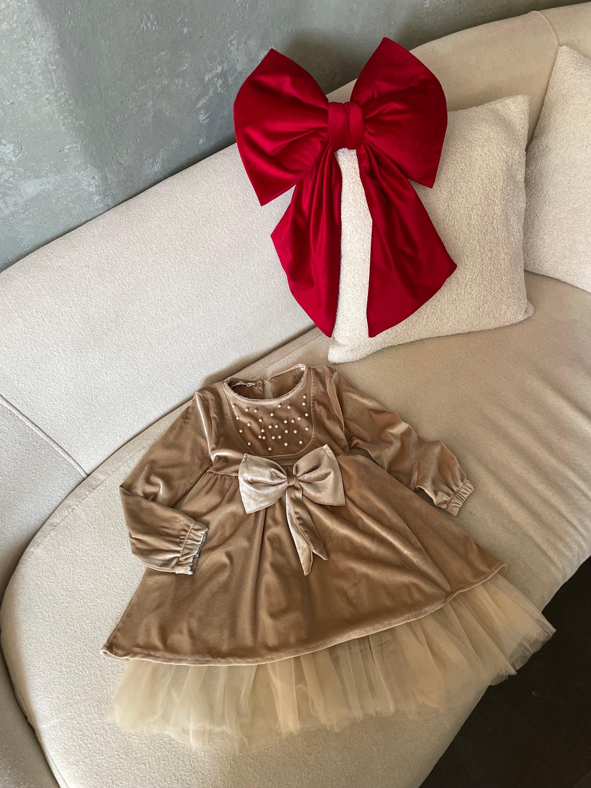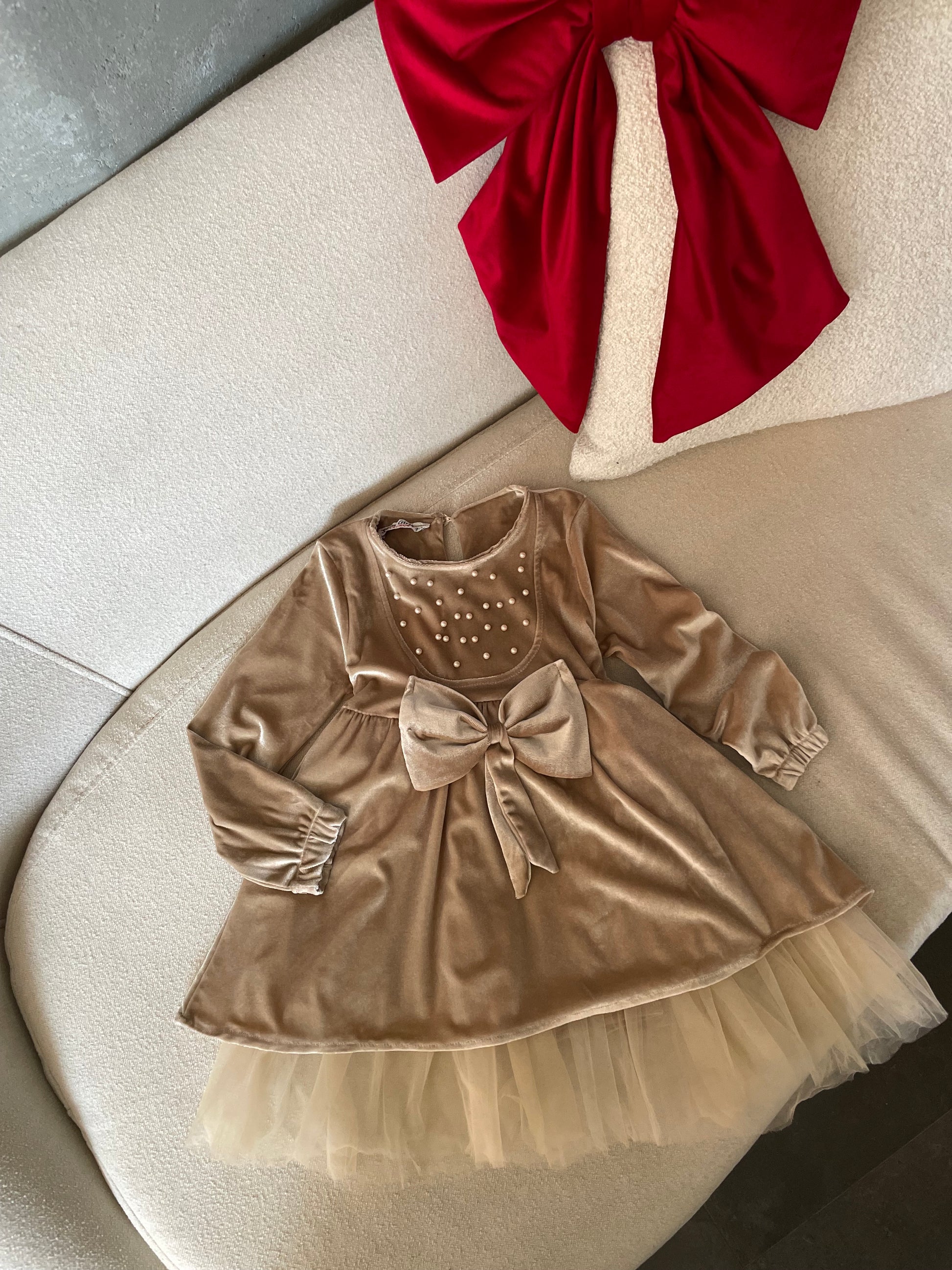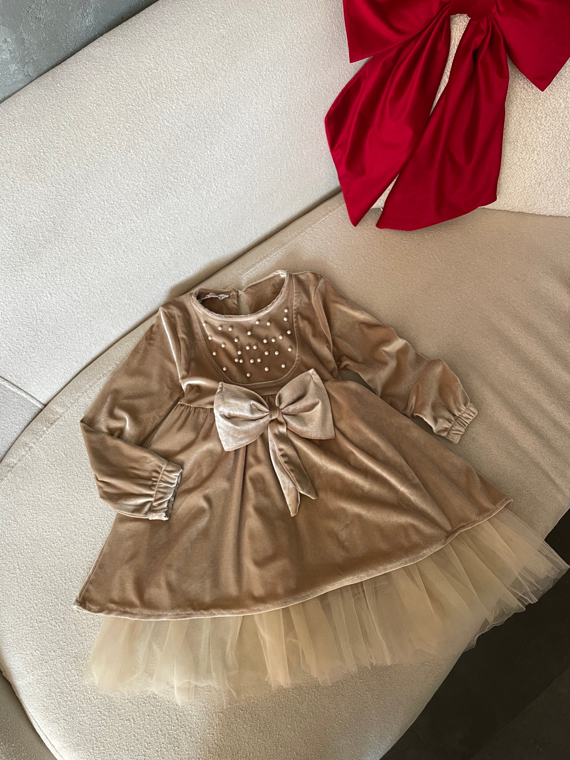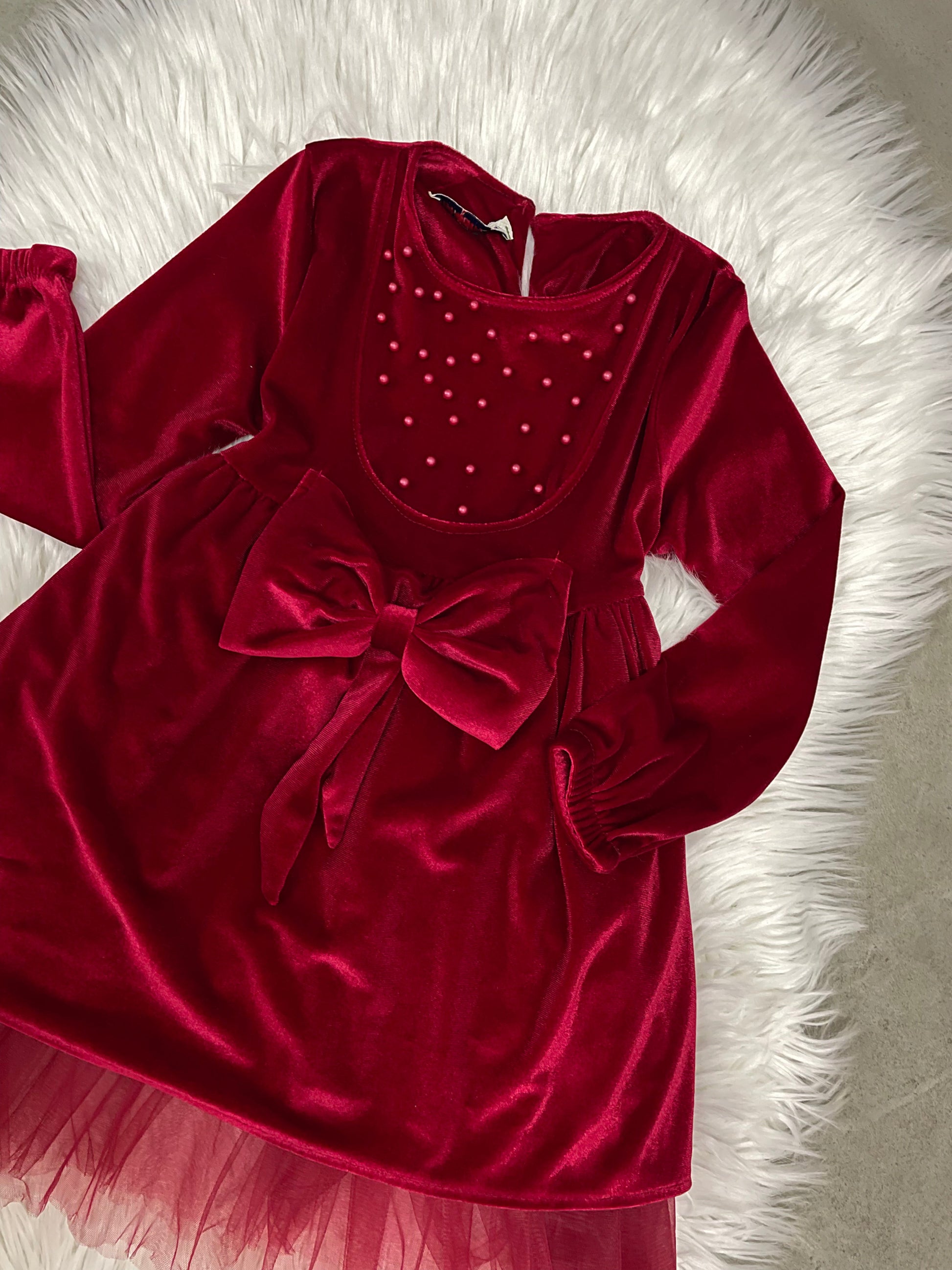 Fustan velvet me krahe te gjata. Ka perla ne pjesen perpara dhe nje fjongo ne mes. Vjen me tyl ne pjesen e poshtme. Komod dhe ka super cilesi.